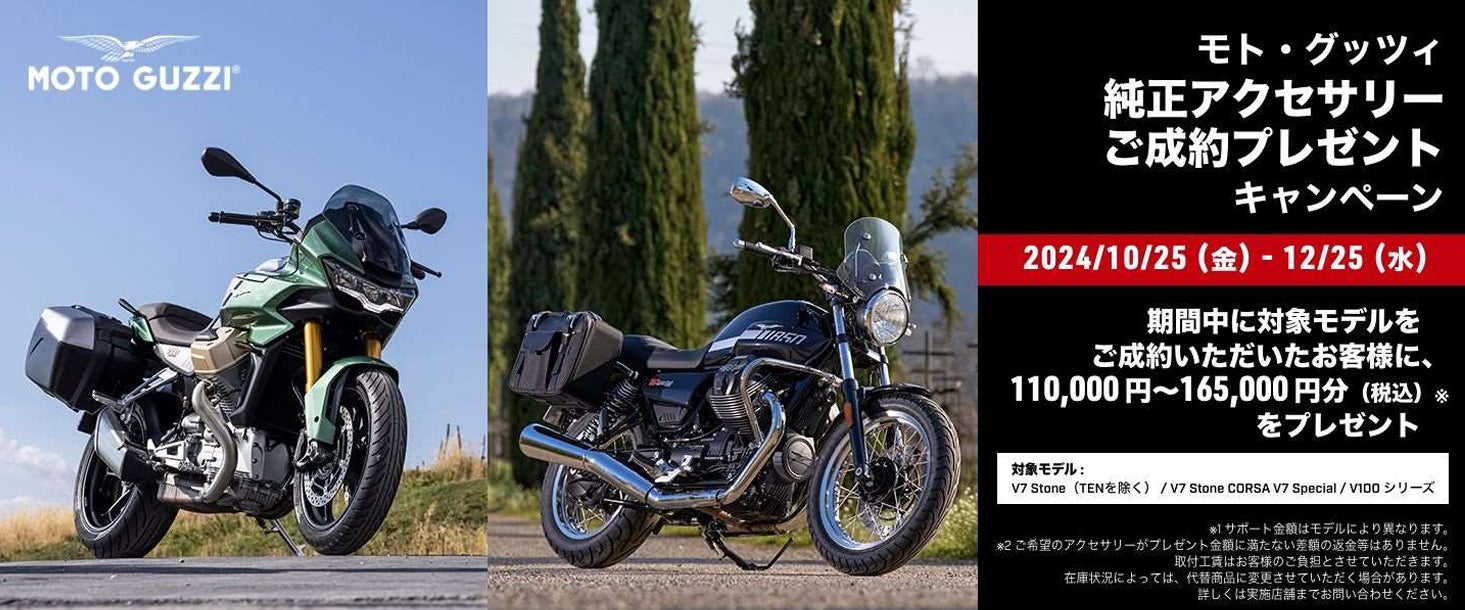 モト・ グッツィが誇る唯一無二の走りを一層楽しく便利にする純正アクセサリーを、V7シリーズとV100 Mandelloをご 成約いただいたお客様に、110,000円~165,000円分(税込)※をプレゼントするキャンペーンを、2024年10月 25 日(金)から12月25日(水)まで、モト・グッツィ正規販売店にて実施いたします。(※サポート金額はモデルにより異なります。)