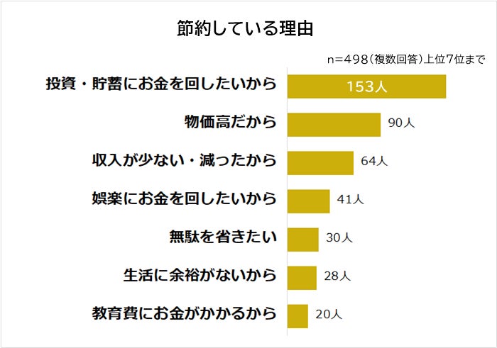 1位は「投資・貯蓄にお金を回したいから(153人)」。「将来のため」「何かあったときの予備費として」など、将来に備えて節約している人が多いようです。