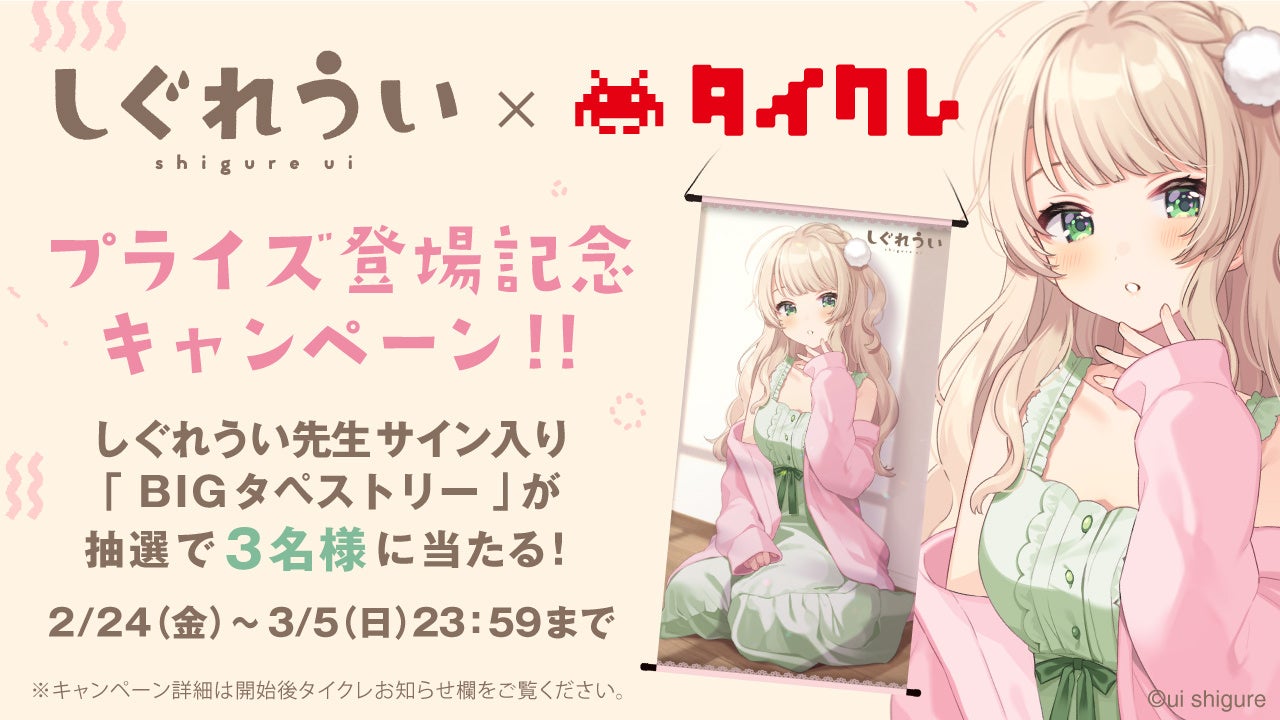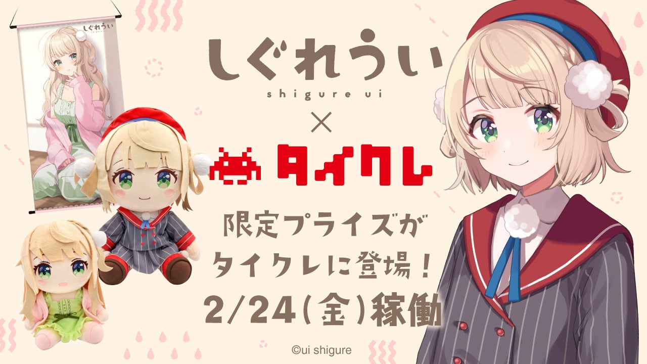 株式会社タイトー(本社:東京都新宿区)は、いつでもどこでもクレーンゲームが楽しめる「タイトーオンラインクレーン(以下タイクレ)」にて、イラストレーターかつVTuberとして大活躍の「しぐれうい」とコラボレーションし、本人描き下ろしのイラストを使用した限定プライズを2月24日(金)21時から展開いたします。