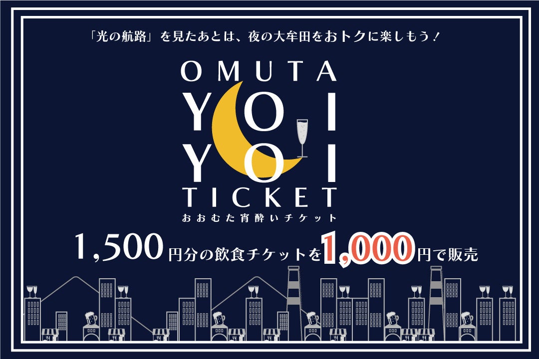 11月と1月に、三池港に現れる「光の航路」を見物される多くの方に、市内の飲食店へ足を運んでいただくとともに、コロナ禍における飲食事業者の支援を目的として、プレミアム付きの飲食チケット「おおむた宵酔いチケット」を販売します。