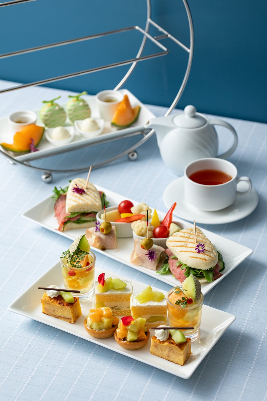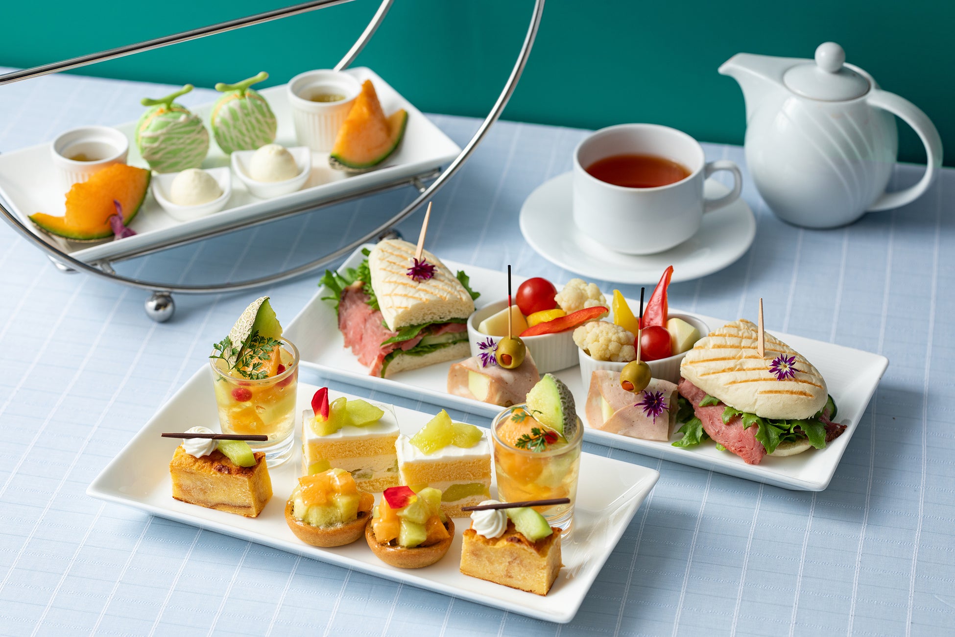 毎年好評のメロンのフォルムがかわいいマカロンやメロンパン仕立てのスコーン、コールドビーフパニーニやシャキシャキ食感に注目!小笠原産の青パパイヤのセイボリーなど初夏を感じるアフタヌーンティー
