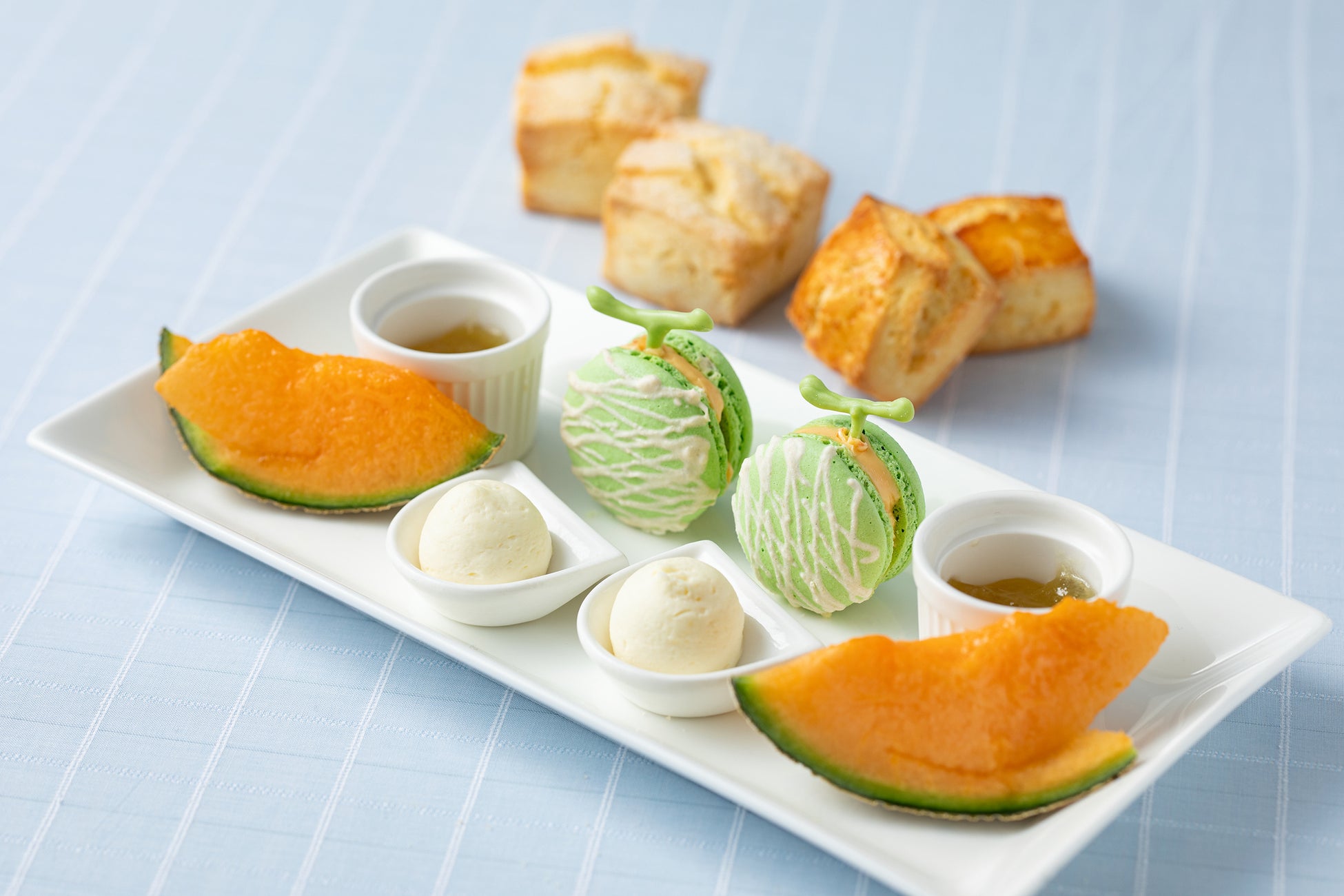下段では、昨年もかわいいメロンのフォルムでご好評をいただいた、メロンが香るマスカルポーネバタークリームを挟んだ“マカロン”と瑞々しいフレッシュなメロン、そして別皿でご用意するスコーンは、メロンパンのような味わいとプレーンの2種類、メロンの青臭さを消すためにリンゴが加えられた “メロンとリンゴのジャム”とマスカルポーネクリームでお楽しみいただきます。