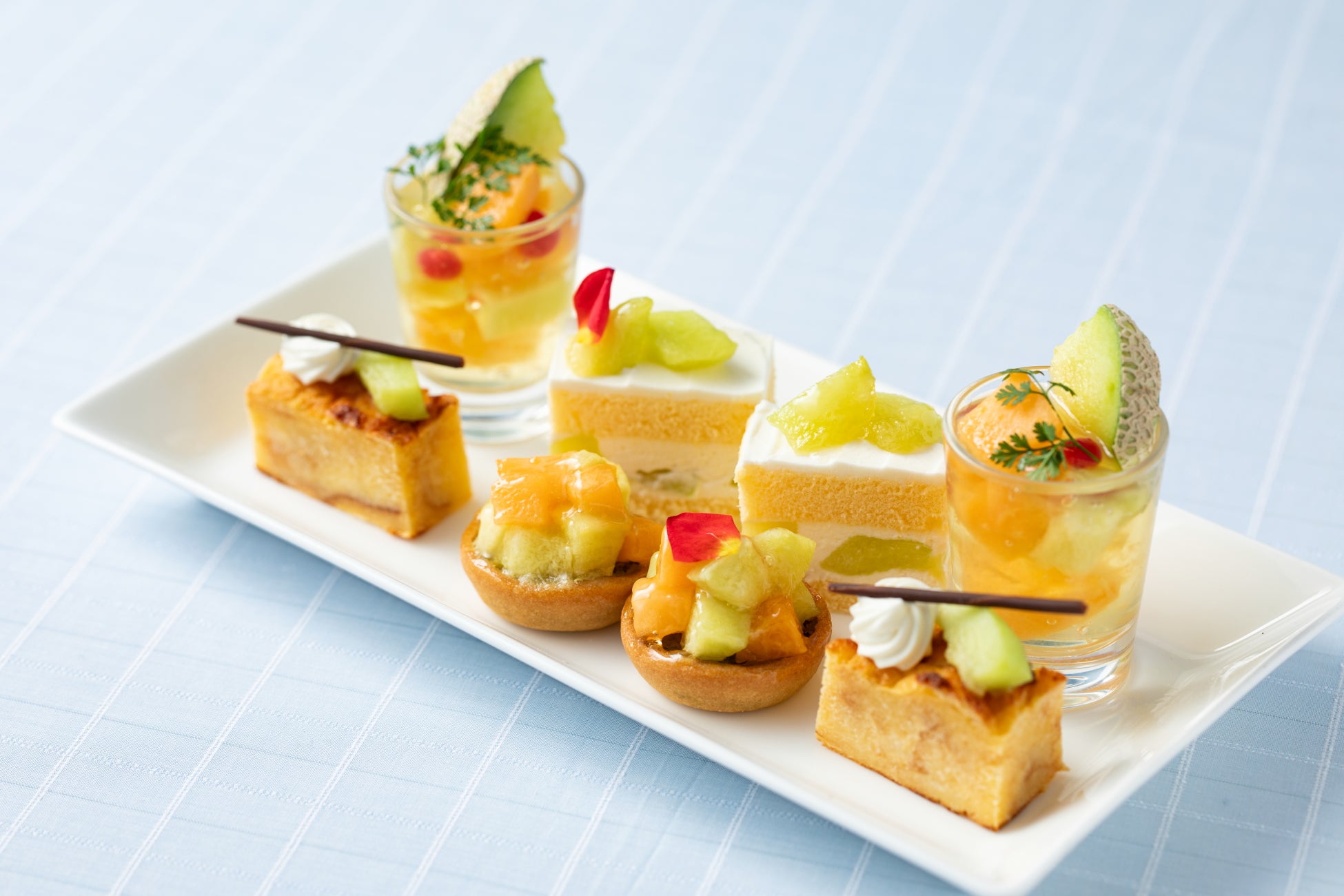 上段には、見た目が爽やかでフレッシュなメロンの果肉が楽しめる“メロンと白ブドウのジュレ”や立川市伊藤養鶏場のこだわりたまご“たまごころ”で焼き上げた自家製パンの“パンプディング”、心地よい酸味が広がる“メロンと甘夏のタルト”とサウスコートの定番“ショートケーキ”をご用意。