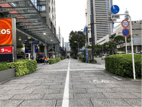 エリア内には、歩道内に自転車マークがペイントされた自転車用のレーンが複数ありますが、歩道の中に自転車のレーンがあったとしても、電動キックボードはここを走行してはいけません。車道の最も左の車両通行帯、もしくは普通自転車専用通行帯を走行してください。