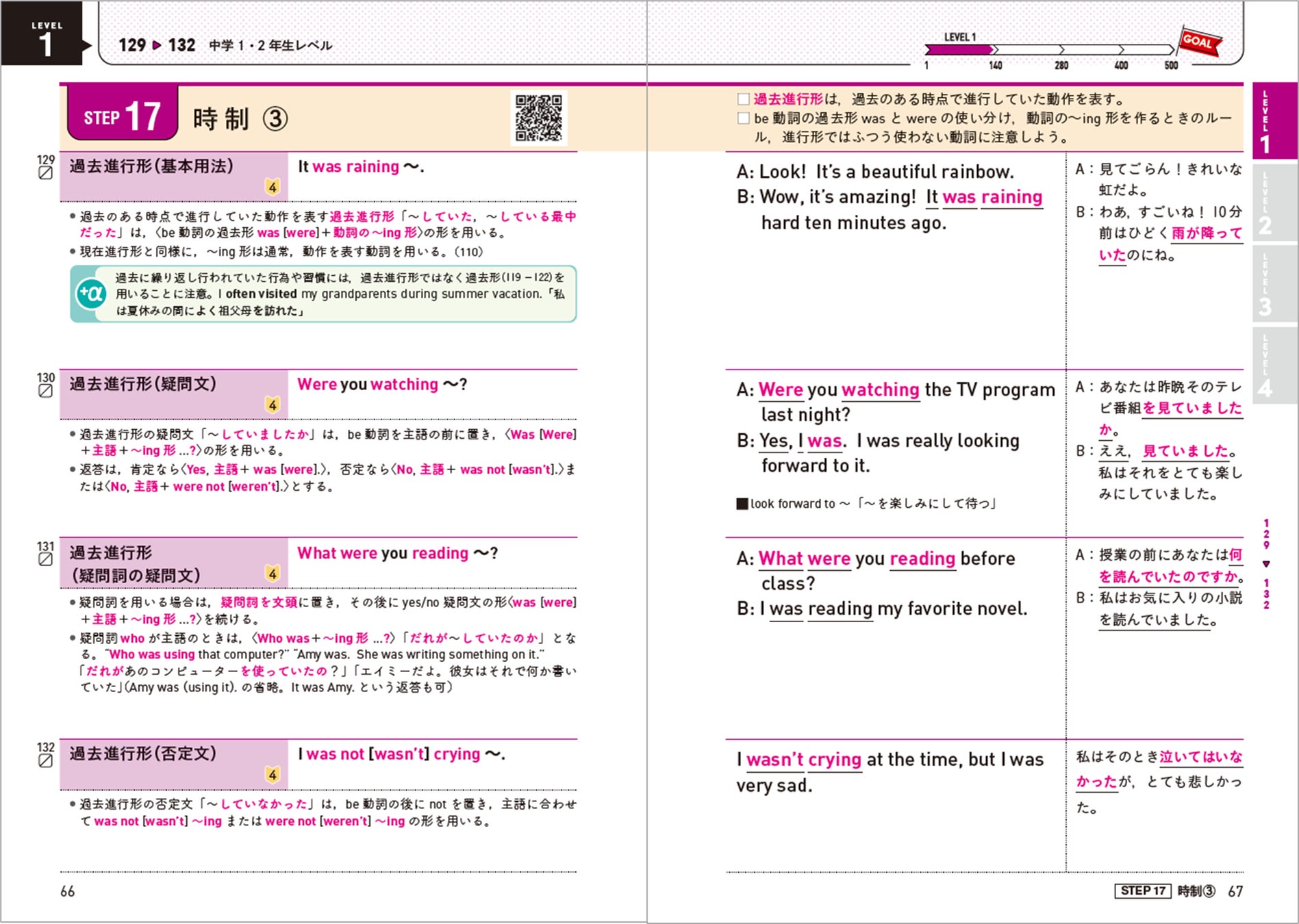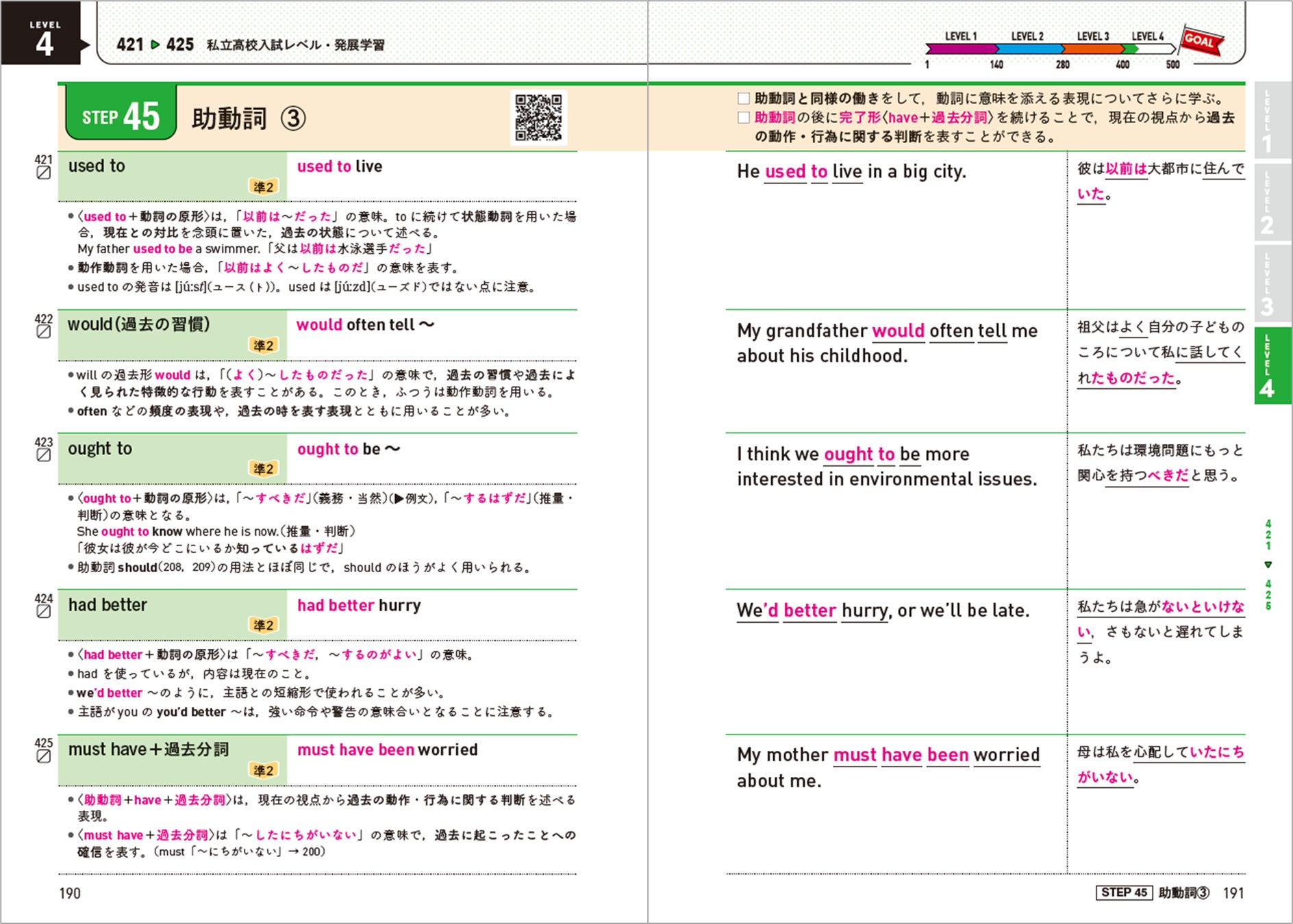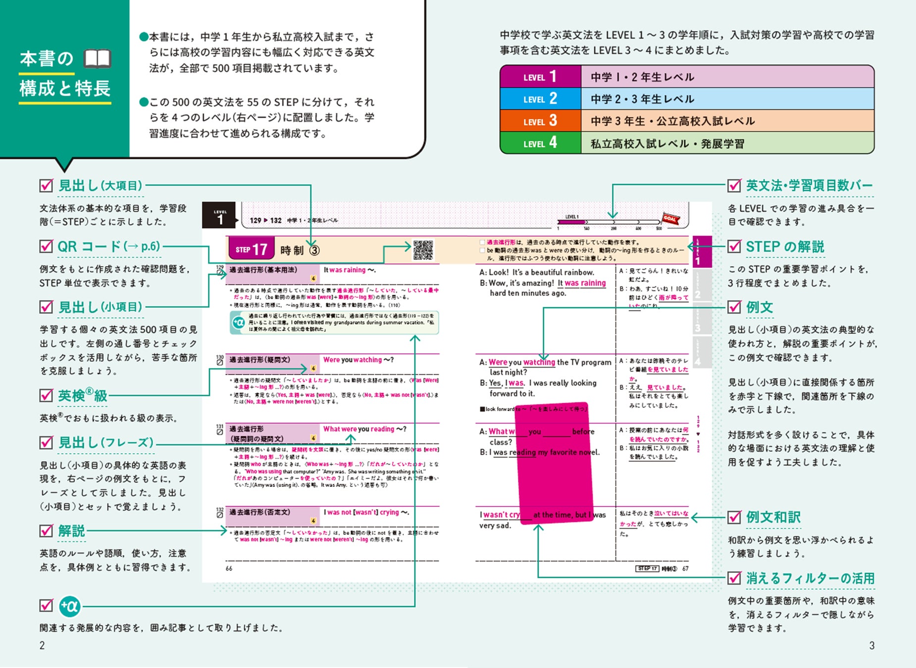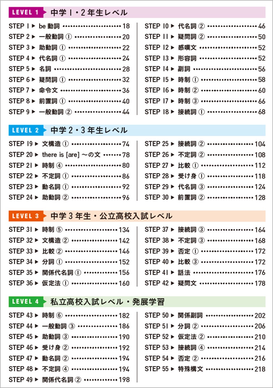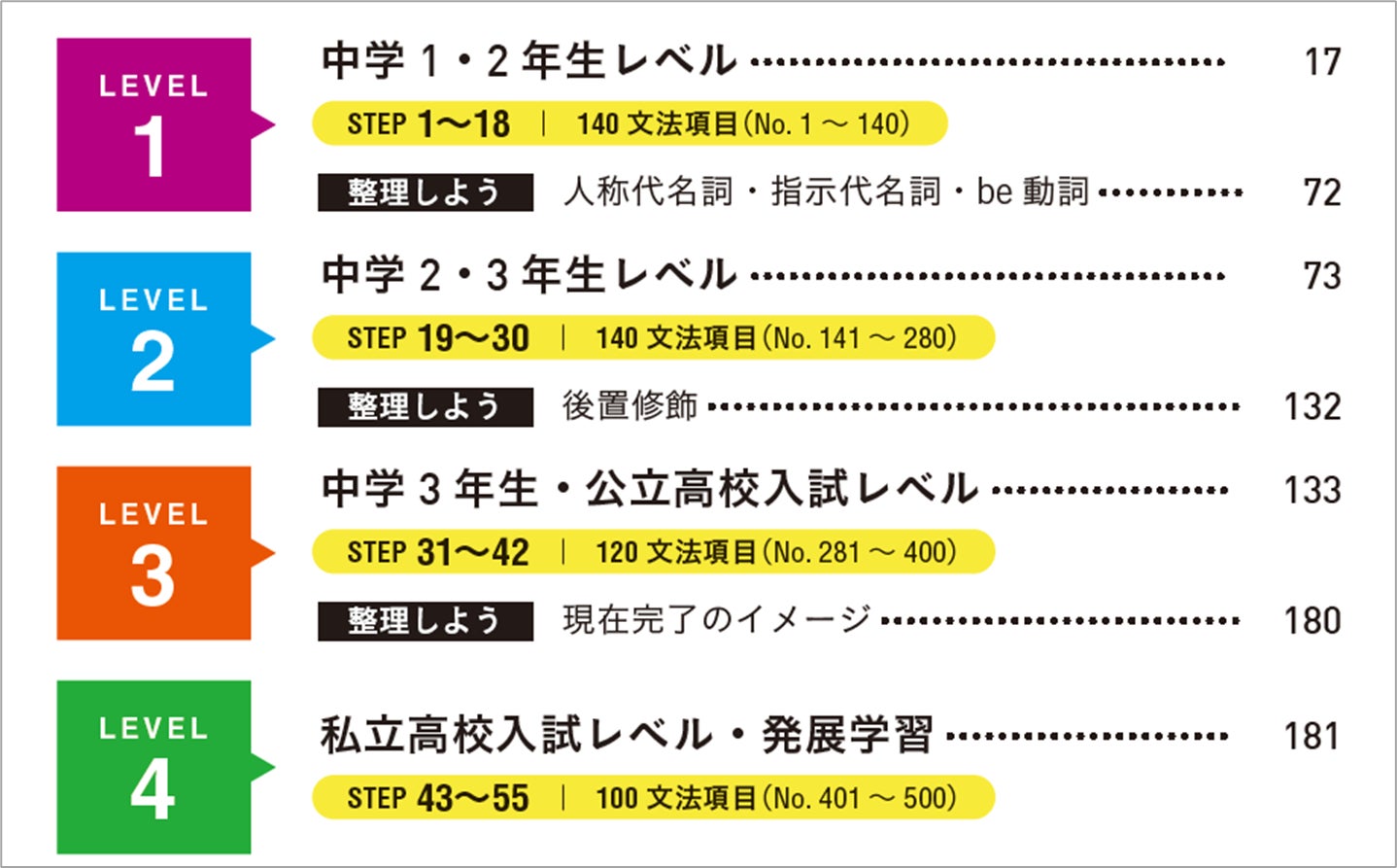 本書には、中学1年生から私立高校入試まで、さらには高校の学習内容にも幅広く対応できる英文法が、全部で500項目掲載されています。この500の英文法を55のSTEPに分けて、それらを4つのレベルに配置しました。学習進度に合わせて進められる構成です。