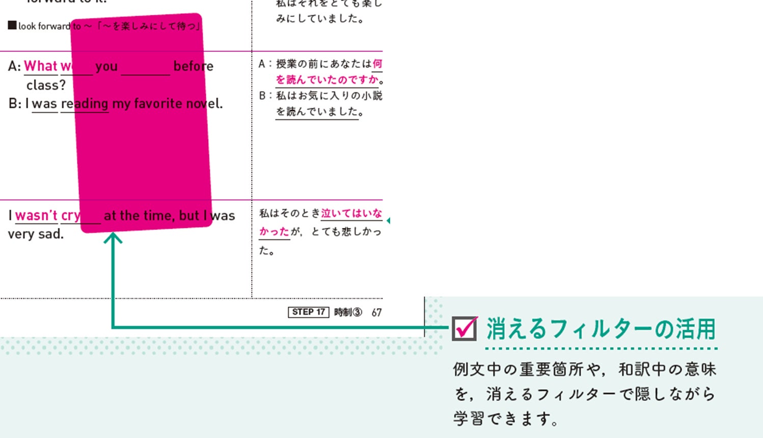 ・「消えるフィルター」を使えば、例文中の重要箇所や、和訳中の意味を隠してくり返し学習することができます。