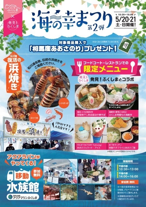 株式会社スペースワン(本社:福島県郡山市)は、福島県産品のおいしさや魅力を消費者の皆様に発信するオンラインストア「ふくしま市場」を運営。この度、「道の駅ふくしま×発見!ふくしま」のコラボイベント企画運営を受託し、5月20日(土)・ 21日(日)の2日間限定で福島常磐ものを堪能できる「海の幸まつり 第2弾」を開催します。