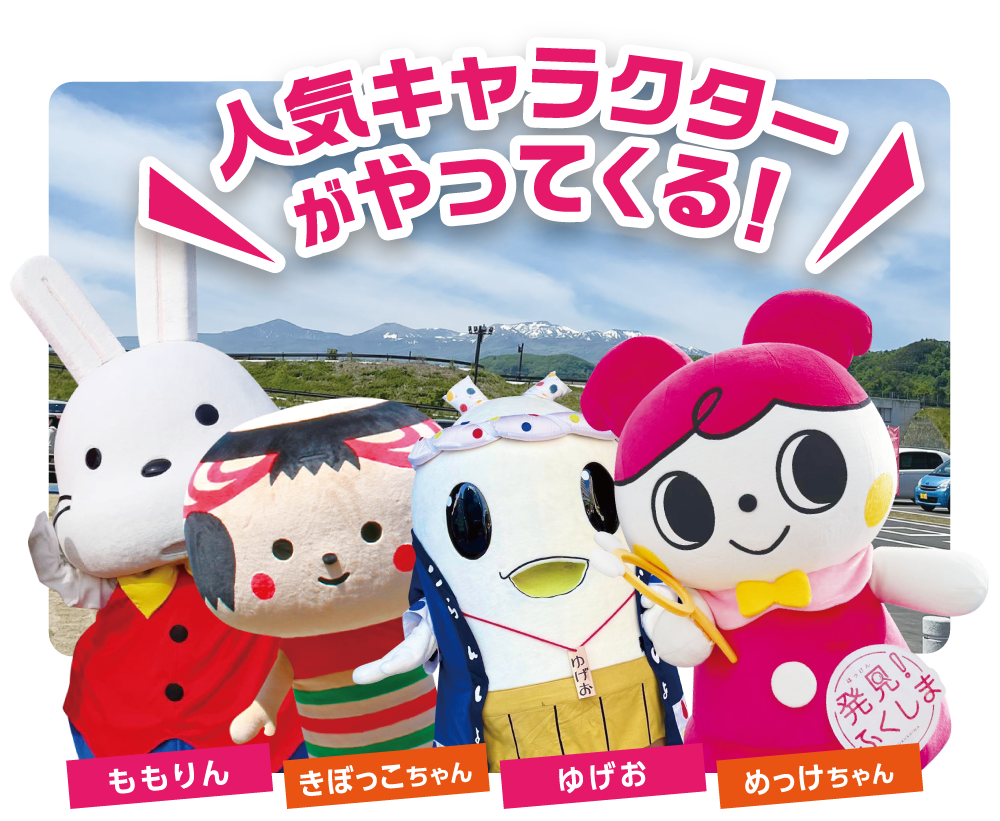 めっけちゃん(発見!ふくしま公式キャラクター)、ゆげお(飯坂町マスコットキャラクター)、きぼっこちゃん(土湯温泉キャラクター)、ももりん(福島市観光キャラクター)とふれあうことができます。こんなに集結することはめったになにかも!?