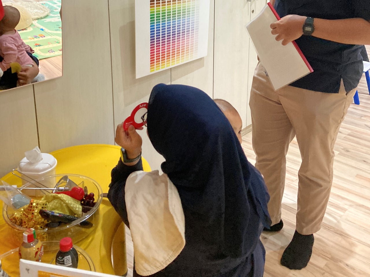 ①「赤ちゃんめがね®」で赤ちゃんの見えにくさを体験。いろいろな色、鏡、日用品など、赤ちゃんの気持ちになって見てみます。