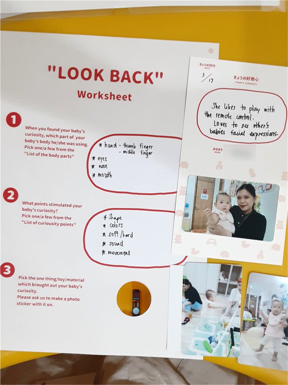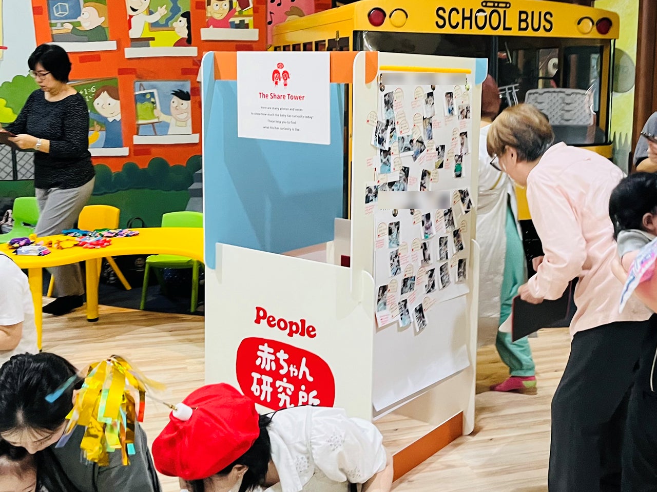 ③最後に、ママ・パパが「気づきタワー」に掲示された気づきを参考に、わが子が好奇心を発揮した瞬間を振り返ります。身体のどの部分を使っていたか?好奇心を引き出したポイントは何か?今日一番気に入ったアイテムは何か?を振り返り、「きょうの好奇心カード」を完成させていただきます。