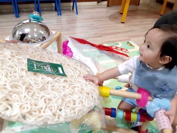 ②いろいろな素材、日用品、おもちゃなど、赤ちゃんの好奇心を引き出すアイテムで自由に遊んでいただきます。研究員は、赤ちゃんが遊んでいる様子を観察。好奇心に関する気づきを、写真と一緒に、「気づきタワー」に貯めていきます。