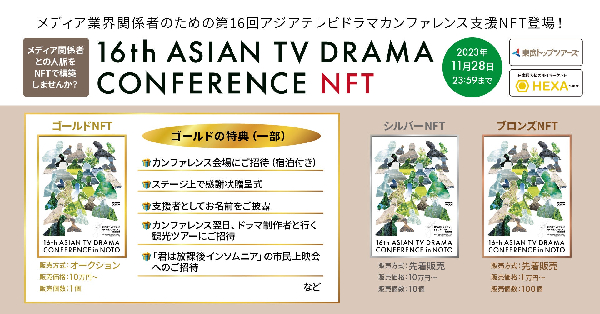 日本最大級のNFTマーケット「HEXA(ヘキサ)」では、一般の参加者は入り込めない第16回アジアテレビドラマカンファレンスに、NFT購入による支援を通じて特別招待されたり、招待枠をゲットしたり、支援者として名前を掲載されるメディア業界関係者のための支援NFTの販売を開始しました。支援NFTは東武トップツアーズ株式会社と共同で発売します。