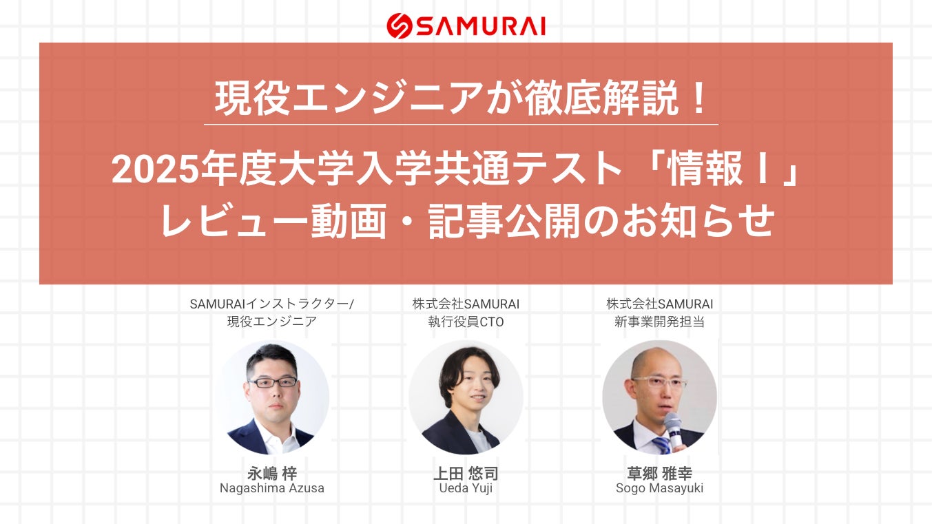 プログラミングスクール「侍エンジニア」を運営する株式会社SAMURAI(本社:東京都、代表取締役社長:羽田 吾立、以下:当社)は、2025年1月19日(日)に行われた2025年度大学入学共通テスト「情報I」について、侍エンジニアの講師であり現役エンジニアでもある永嶋梓、当社執行役員CTOの上田悠司、新事業開発担当の草郷雅幸がレビューを実施し、テストの内容やポイント、次年度の共通テストを受験する生徒たちに向けて「どのような学習が求められるか」を徹底解説しました。