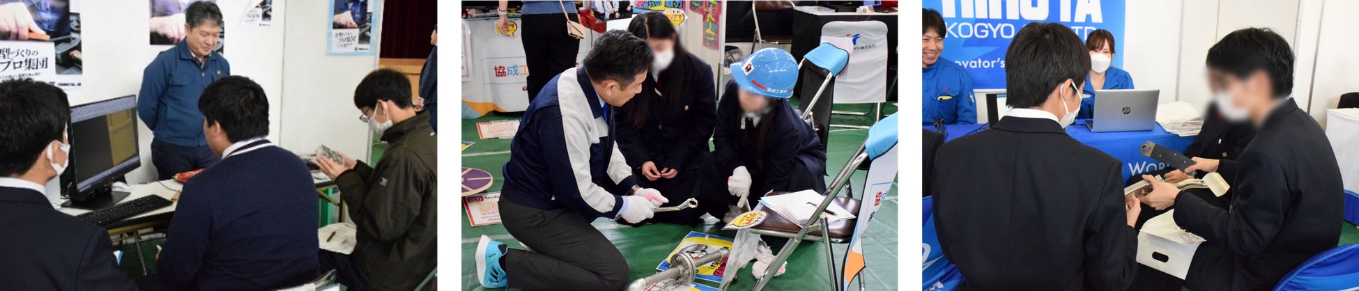 両校の特別授業では、専門分野でもある製造・建設業を中心に様々な企業にご参加いただきました。生徒は関心のある分野の企業を各社15分ずつ回り、業界や企業について話を聞き理解を深めました。また、実際の製品を触る体験やおしごと体験を通して自身の将来のイメージを膨らませていました。真剣にメモを取る様子や楽しそうに体験をする様子が印象的でした。
