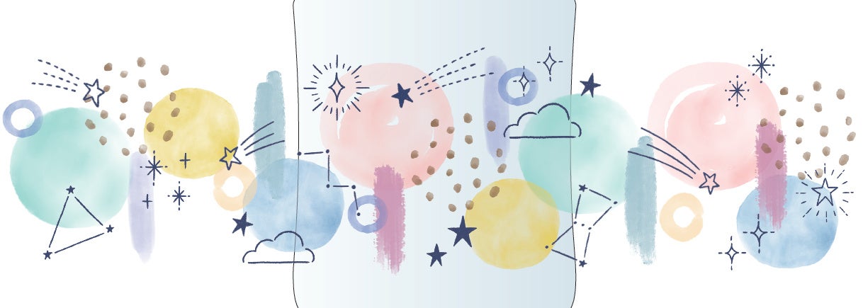 「shining sky(輝く空)」と名付けたボトルデザインには、彩り豊かに輝く空をモチーフに「赤ちゃんの未来が色とりどりに輝きますように」という願いが込められています。