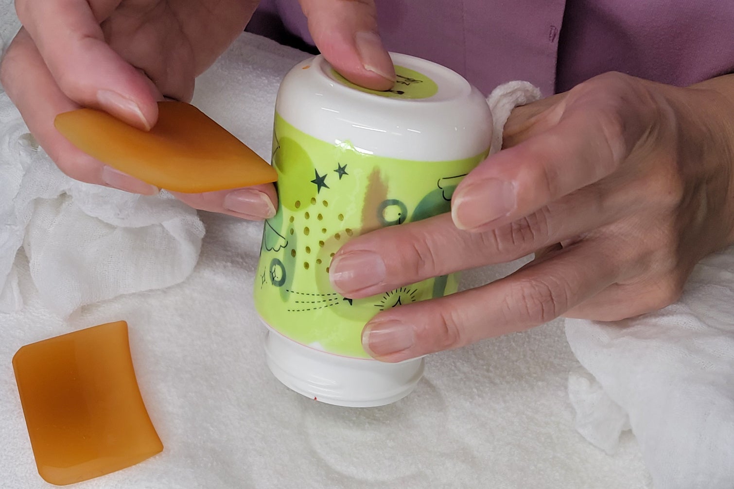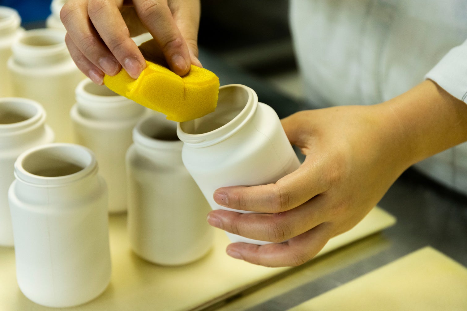 本商品の共同開発では、キャップ取り付け部であるネジには特に高い精度が求められ、NARUMIでも量産製造は初挑戦となりました。ネジ部・天面の仕上げや、目盛り・絵柄の転写などを職人が一つひとつ手作業で行い完成させる、高い技術とこだわりのつまった哺乳びんです。