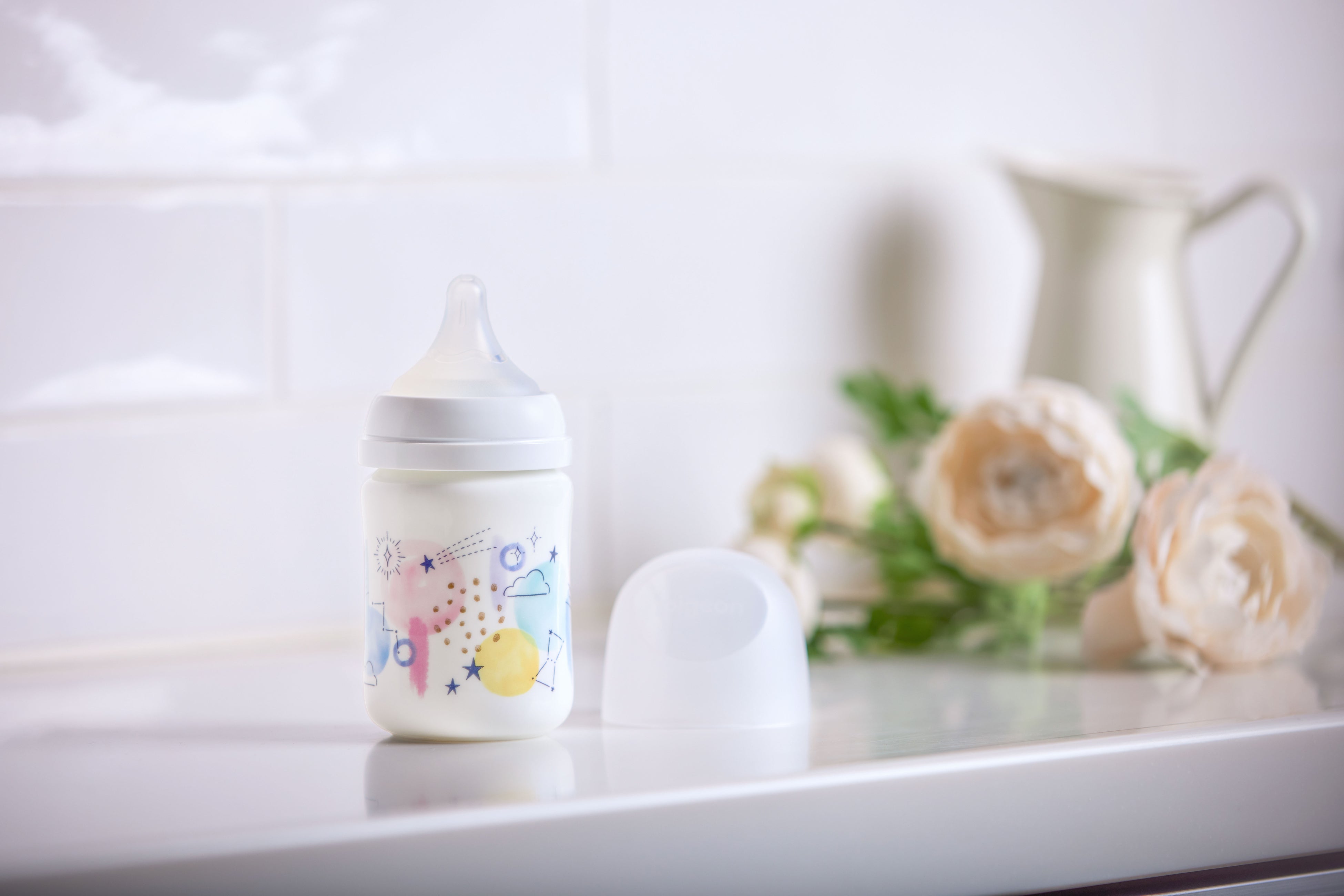 表面の光沢と鮮やかな発色が特長のボーンチャイナ素材を採用したことにより、多色使いで水彩画のような淡く繊細なデザインを実現しました。また、ボトルの側面には目盛りやロゴが無いため、一般的な哺乳びんと異なり、360度どこからでもイラストを楽しめます。