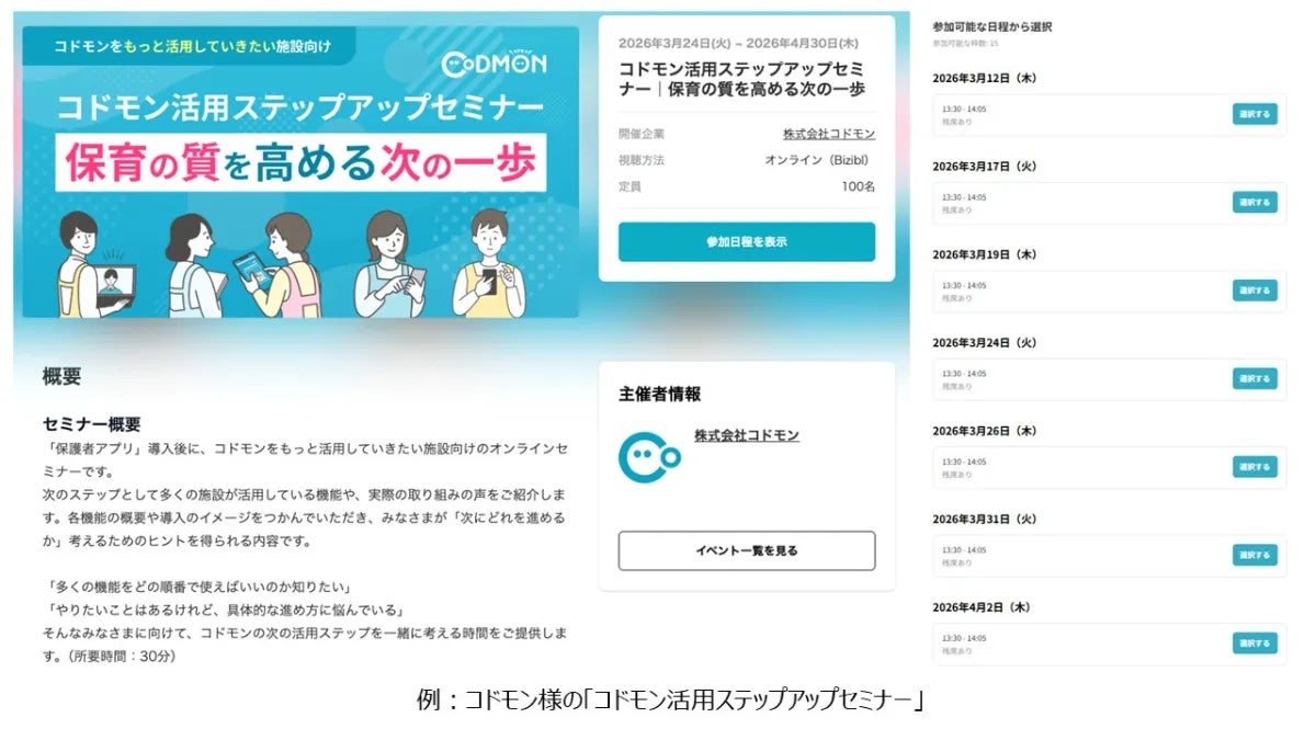 株式会社Bizibl Technologies(本社:東京都千代田区、代表取締役:不明、以下Bizibl)は、ウェビナーマーケティングツール「Bizibl」を活用した、株式会社コドモン(本社:東京都、代表取締役:不明、保育・教育施設向けICTサービス事業)の導入事例を公開しました。