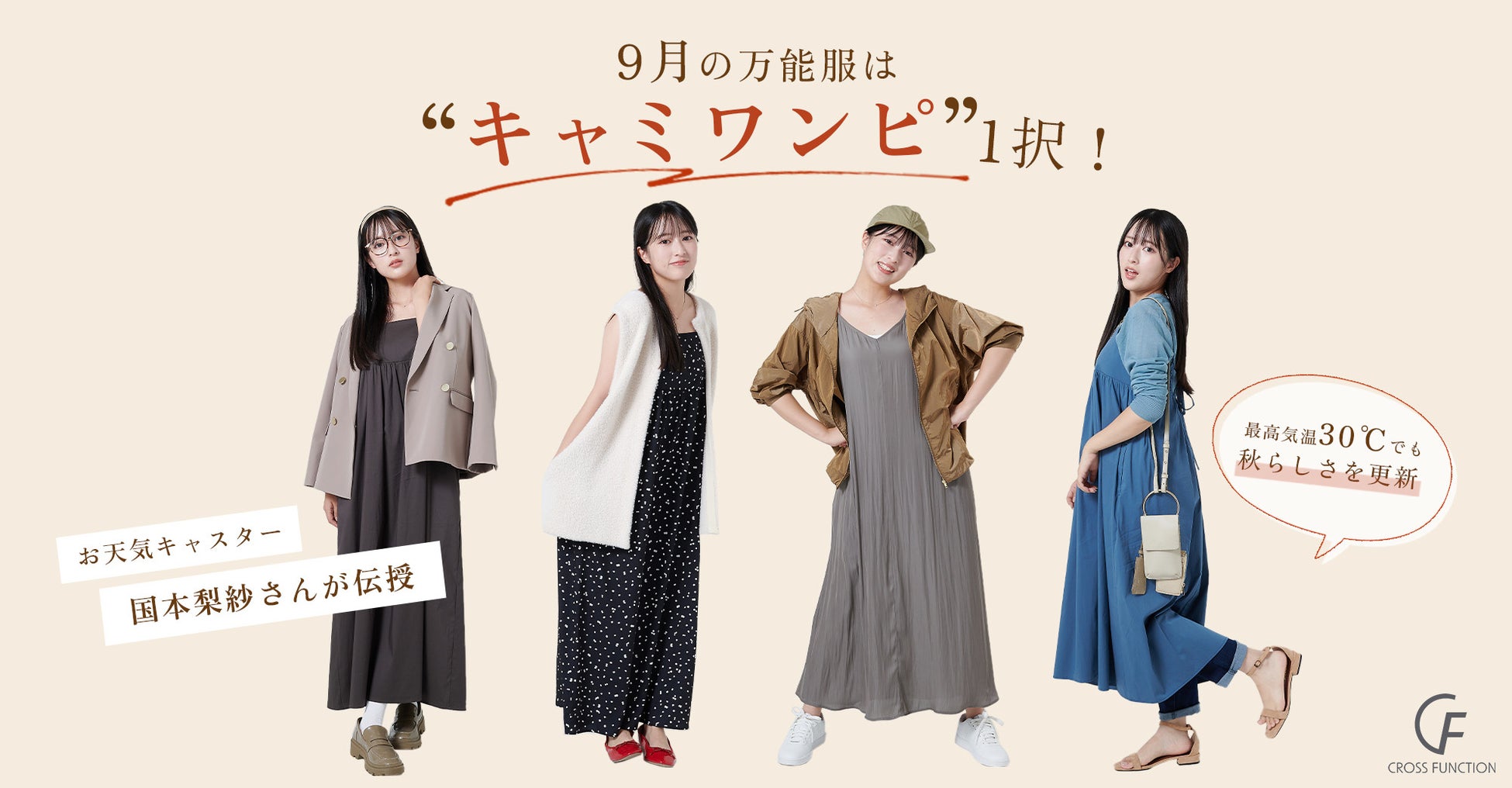 お天気キャスターを務めた経験のある国本梨紗さんに、こだわりの素材と生産ノウハウを活かした人気機能商品だけを揃えた『CROSS FUNCTION』の「キャミワンピース」で最高気温30℃・28℃・27℃・26℃でも楽しめる「秋の着こなし」をご紹介頂きます。残暑の厳しい9月に、暑くても秋らしいおしゃれを楽しめる機能服も一緒にご紹介しています。