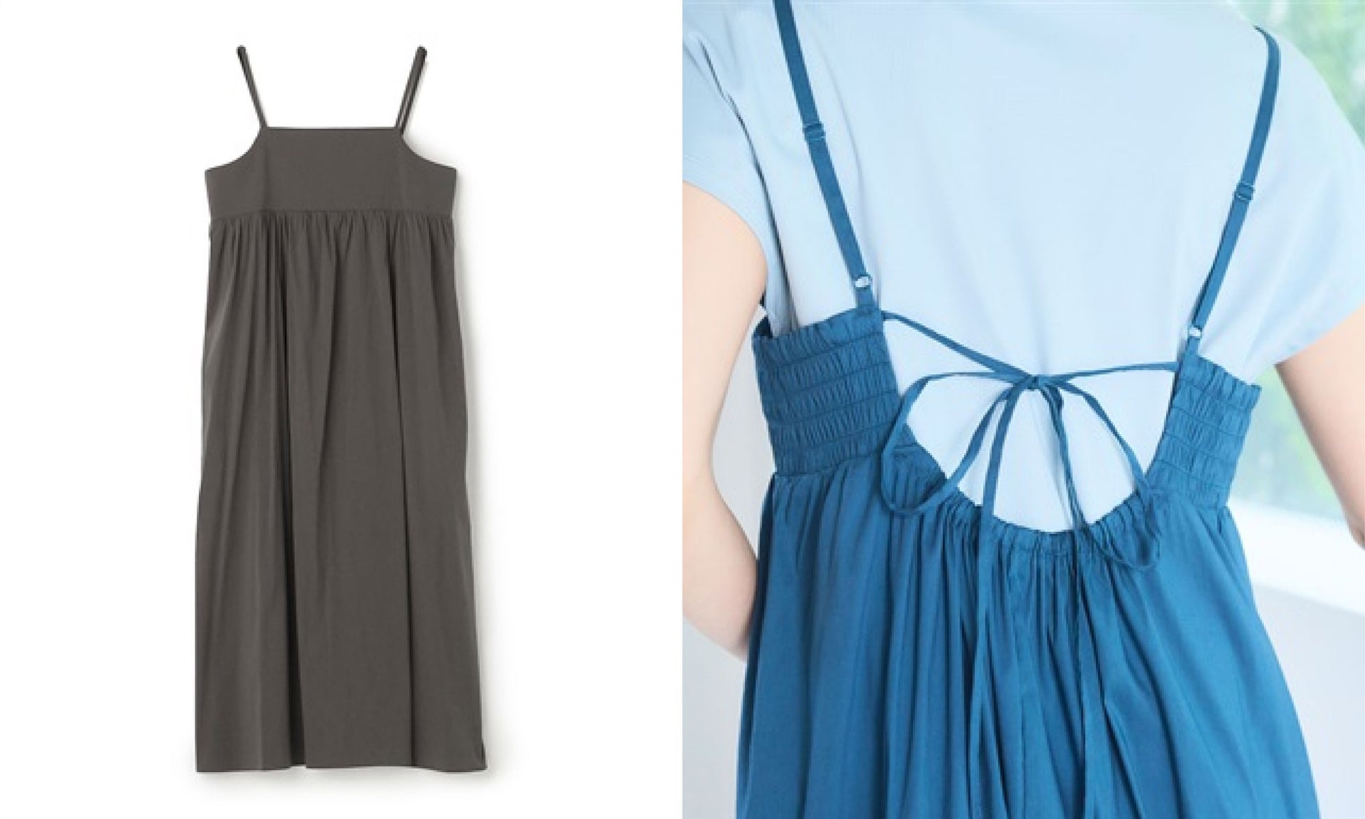 ギャザーの切り替えがスタイル良く見せるくれるキャミワンピ。バックリボンとシャーリングで、ジャケットを脱いだときのシルエットの良さもお約束。洗濯機で洗えるので汗をかいても安心。ポケットがあるのも嬉しいところ。ストラップで長さを調整できるだけでなく、丈が2種類あるので、自分にぴったりの1枚が見つかるはず!