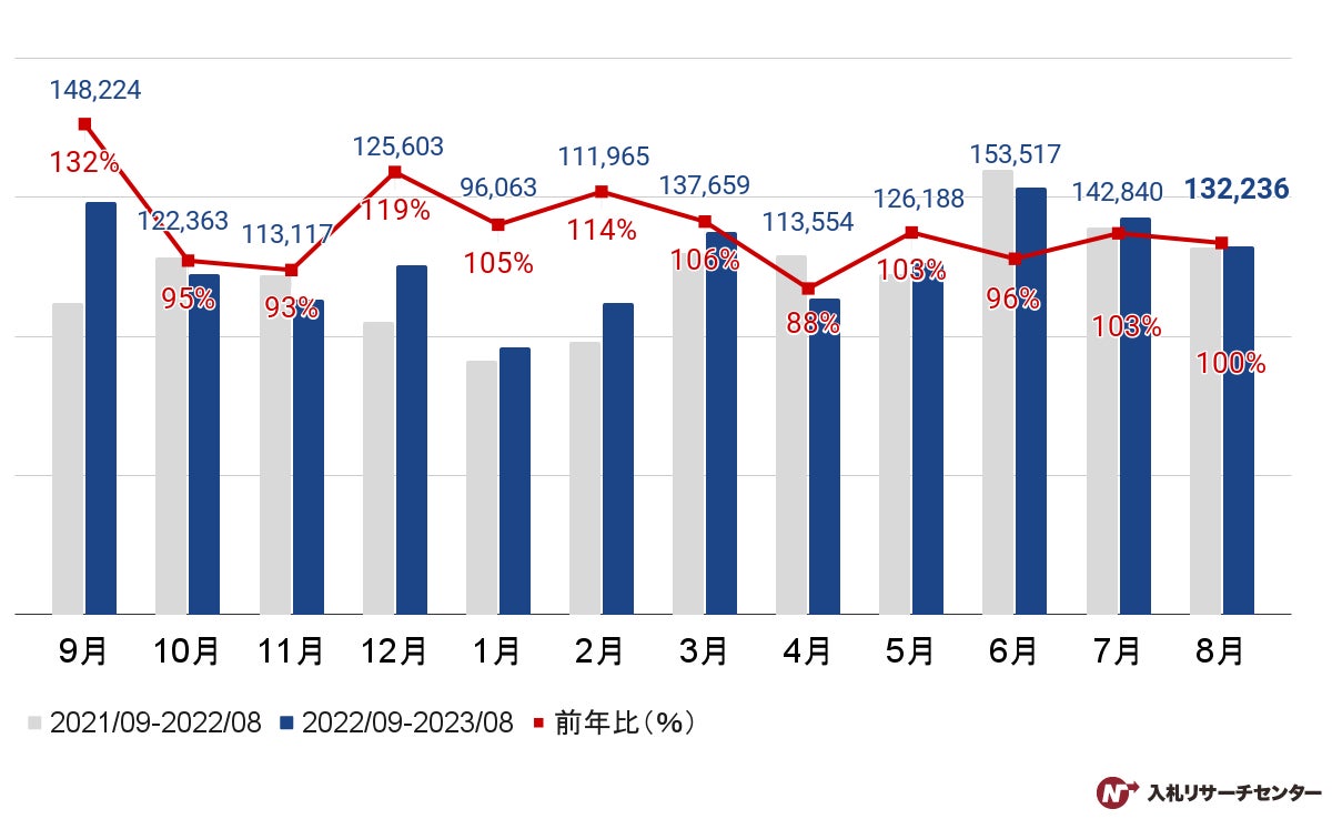 2023年8月の落札案件数の総計は 132,236件で、前年比100%となりました。