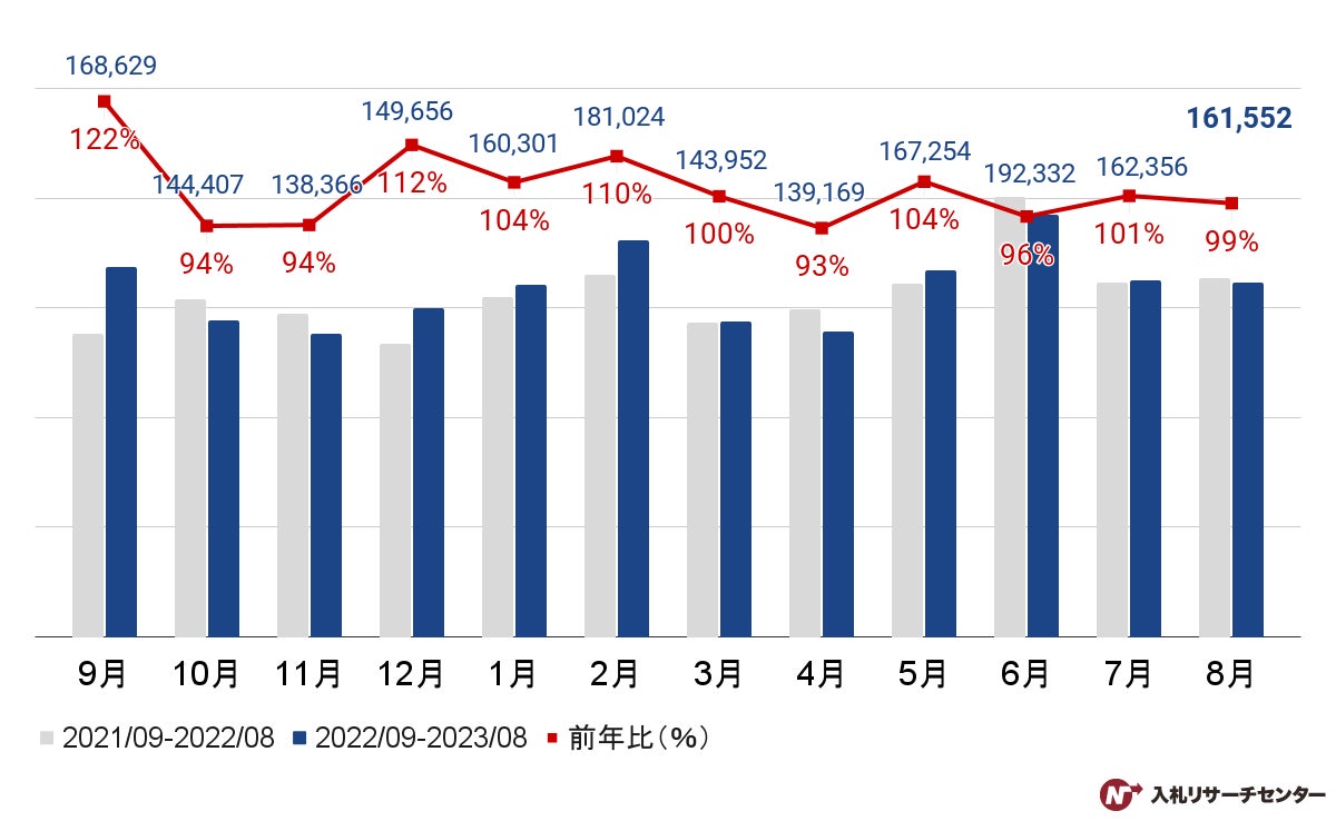 2023年8月の公示案件数の総計は161,552件で、前年比99%となりました。