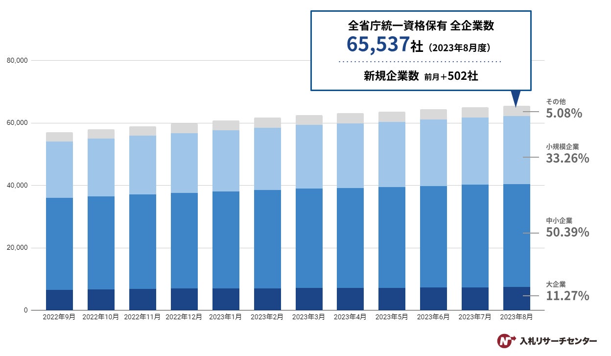 全省庁統一資格保有【全企業数】:65,537社(2023年8月度)