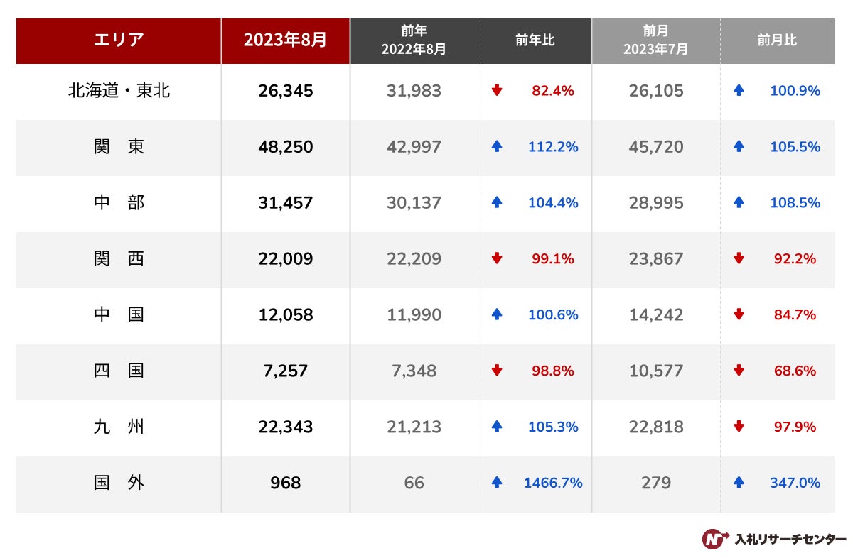 2023年8月のエリア別公示案件数は、エリアにより、前年より増加・減少の傾向が分かれました。
