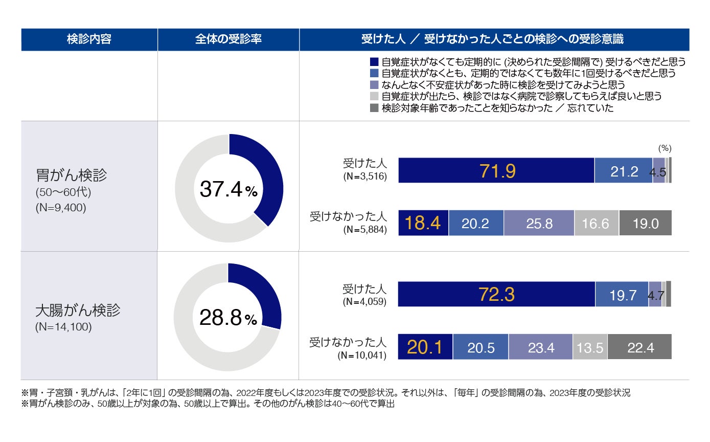 対象年齢全体での胃がん・大腸がん検診受診率は、4割未満となりました。検診受診/非受診者別に受診意識を見ると、検診受診者は「自覚症状がなくとも決められた受診間隔で受けるべき」と回答した人がいずれの検診でも約7割だったのに対し、非受診者は約2割にとどまりました。自覚症状の無い段階で定期的にがん検診を受診することが重要であるとの認識がまだ浸透していない実態が分かりました。