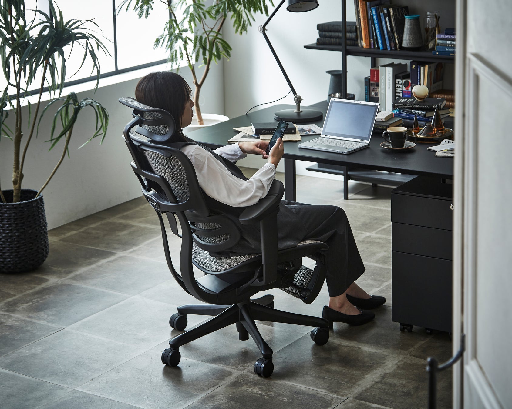 2005年に誕生したエルゴヒューマンは、腰へのフィット感とサポートに重点を置いて設計・開発されました。国内で累計出荷台数31万台を突破、全世界では300万脚以上の販売実績のある多機能チェアです。最も特徴的な「独立式ランバーサポート」はユーザーの体型・体重に応じて可動し、常に腰への負担を軽減するように考慮されています。エルゴヒューマンは体に合ったサポートの適合(アジャスタビリティ)を追求し、より自然な座りを体感できるチェアです。