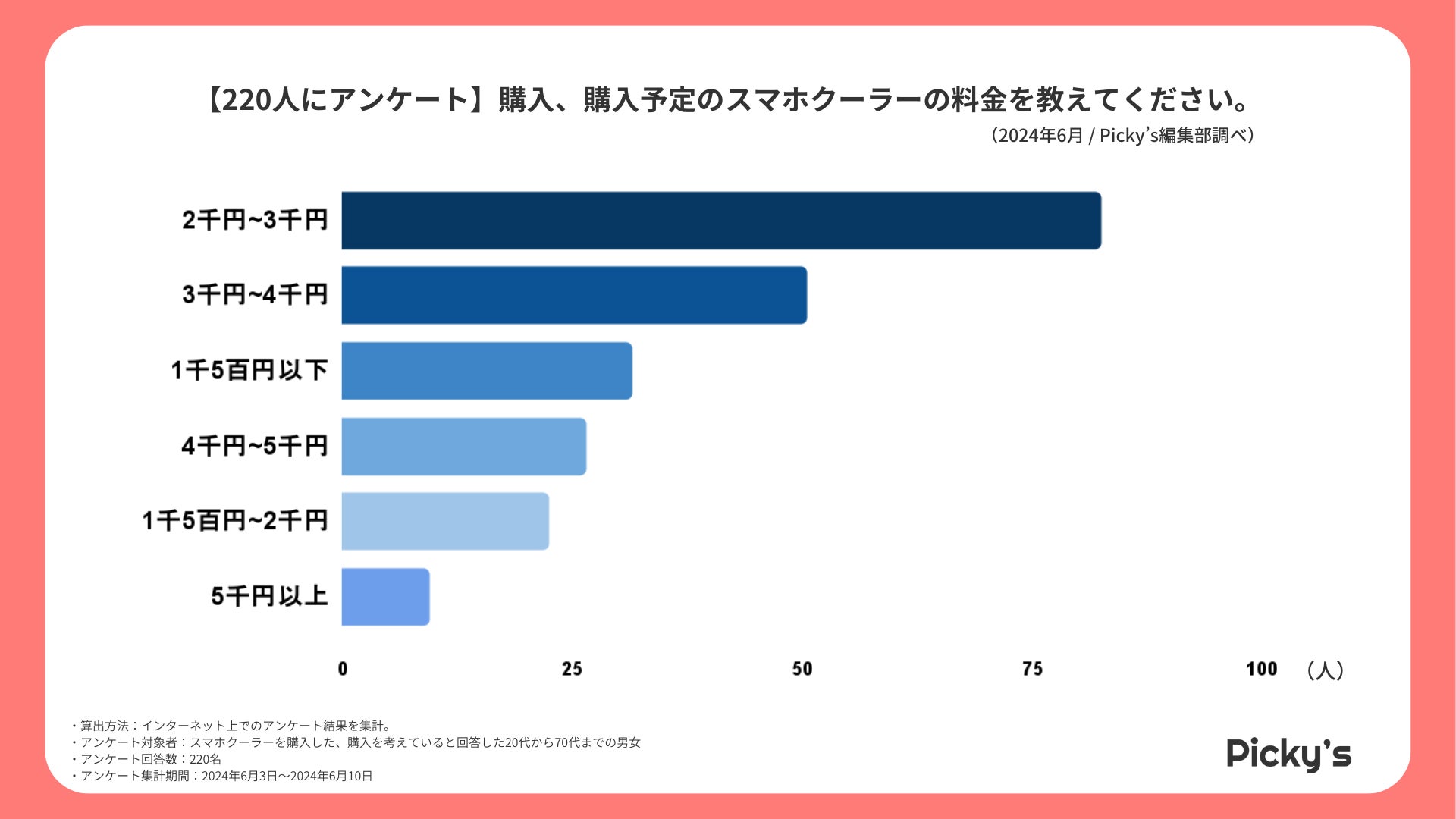 購入または購入予定のスマホクーラーの料金帯で最も多いのは「2千円~3千円」(82票)でした。