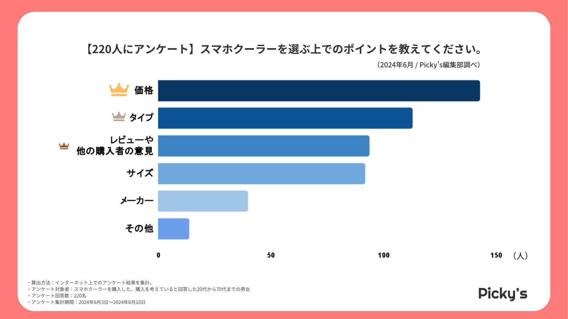 アンケート結果によると、スマホクーラーを選ぶ上で最も重視されるポイントは「価格」(142票)でした。