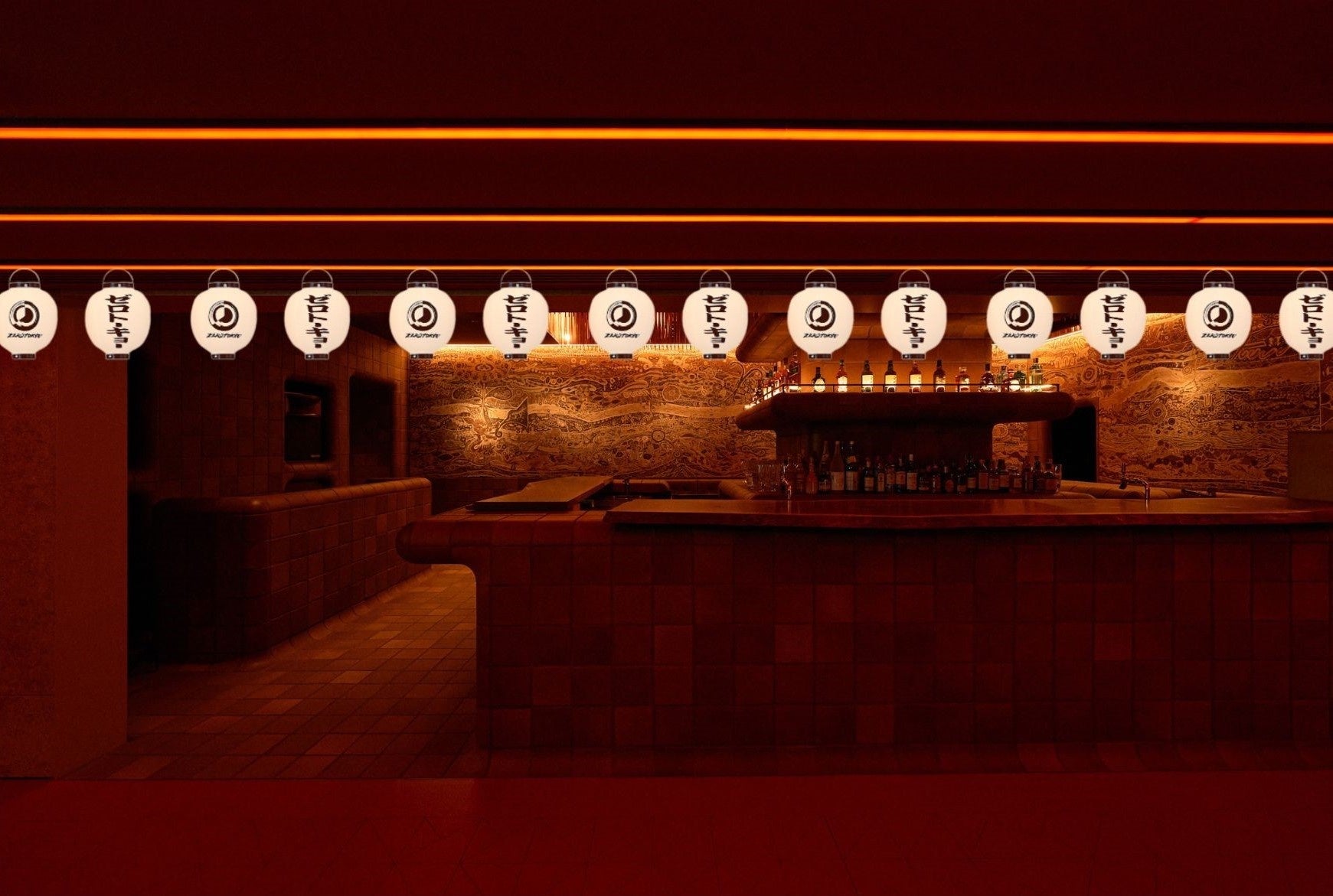 提灯は、古くから日本の祭礼や縁日で人々を照らしてきた祝祭の象徴的な装飾アイテム。今回はその伝統的なモチーフに、本企画のために書き下ろされたロゴをあしらい、エントランスやバーエリアを幻想的に演出します。