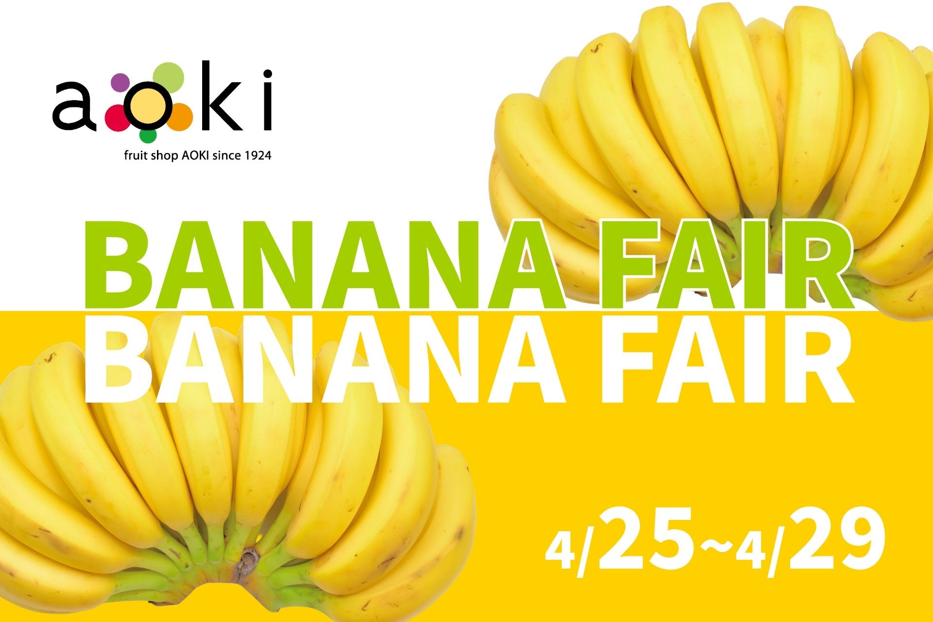 青木フルーツ株式会社(本社:福島県郡山市、代表取締役社長:青木大輔、以下青木フルーツ)が運営するフルーツ専門店「フルーツショップ青木」は、2026年4月25日(土)から2026年4月29日(水・祝)の期間、東武池袋店を除く全店で「ハニーバナナフェア」を開催いたします。青木フルーツの原点として大切に販売しているハニーバナナを特別価格で購入できるほか、フルーツショップ青木 本店では“バナナの木”を展示し、実際にもぎって購入できる体験もご用意しています。