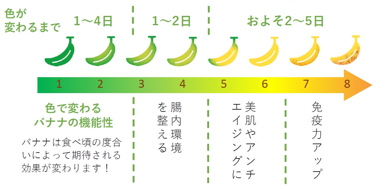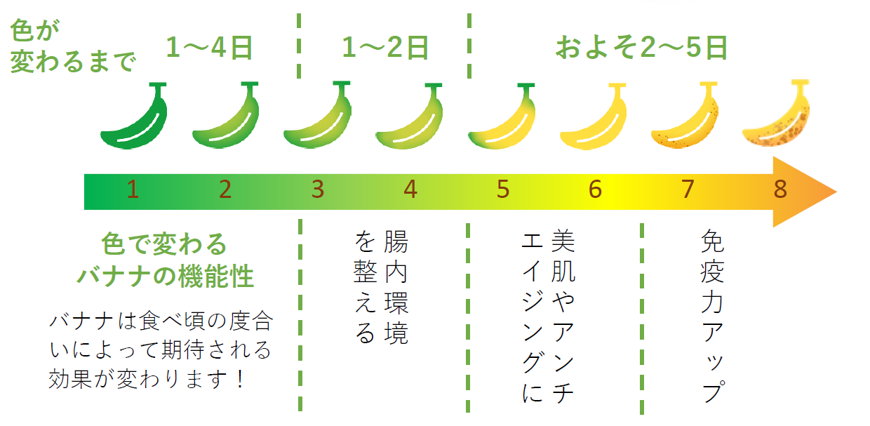 バナナは追熟の過程で甘みと効能が変化します。若い青めのバナナであれば、さっぱりとした甘みで、整腸作用を高めると言われている「難消化性デンプン」を多く含み、シュガースポットと呼ばれる茶色の模様が出てくるころには、濃厚な甘みへ変化し、免疫力を高めると言われる抗酸化作用のあるポリフェノールが増えます。皮の色から追熟の様子が分かりやすいため、日ごとに変化する味わいを楽しみながら、好みの甘さを見つけるのもおすすめです。