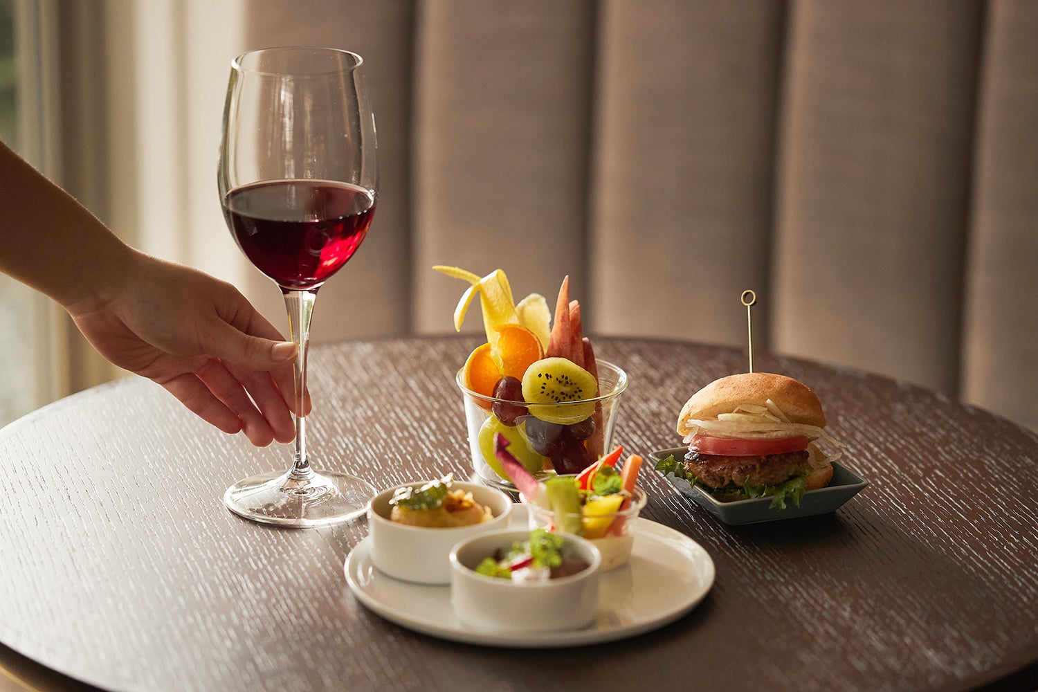 軽飲食が並ぶブッフェカウンターでは、1階「MARKET」の食材を使用した軽食メニューや果物、オリジナルスイーツブランド「RAU」のオリジナルクッキーなど、当館ならではの“GOOD NATURE”なメニューが並びます。カクテルタイムにはアルコールも並び、自由にお楽しみいただけます。