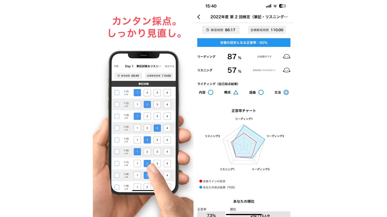 アプリでレッスン内の音声やリスニング問題などの音声が聞けます。また、アプリのスピーキング機能では、本書に収録の面接試験対策(準2級、3級)やスピーキングテスト対策(4級、5級)の解答例のテキストを読み上げて、発音判定することができます。