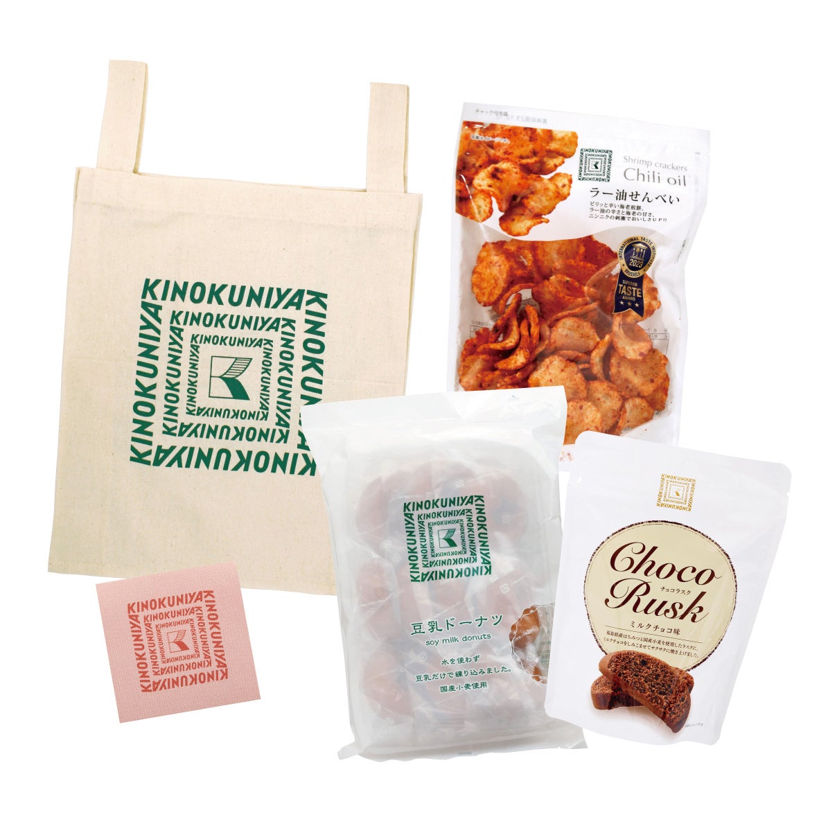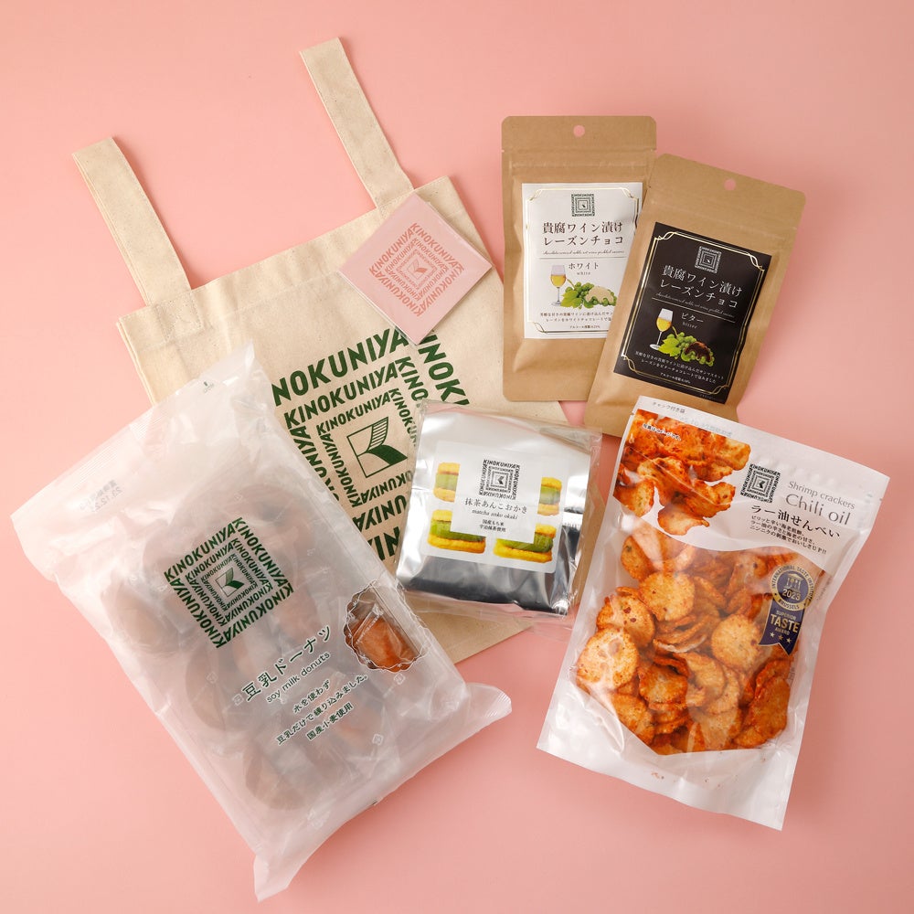 内容:豆乳ドーナツ、抹茶あんこおかき、貴腐ワイン漬けレーズンチョコ ホワイト、貴腐ワイン漬けレーズンチョコ ビター、ラー油せんべい
