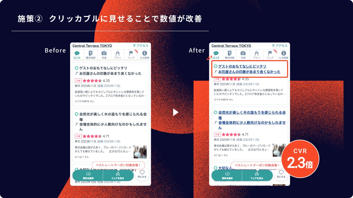 みんなのウェディングでは、口コミや費用明細といったユーザーコンテンツを多くのユーザーが閲覧します。 それらを閲覧したユーザーは予約アクションにつながりやすい傾向があります。口コミの一覧ページより、詳細ページに遷移してもらいやすいUIにすることで、アクション数向上につながったと思います。