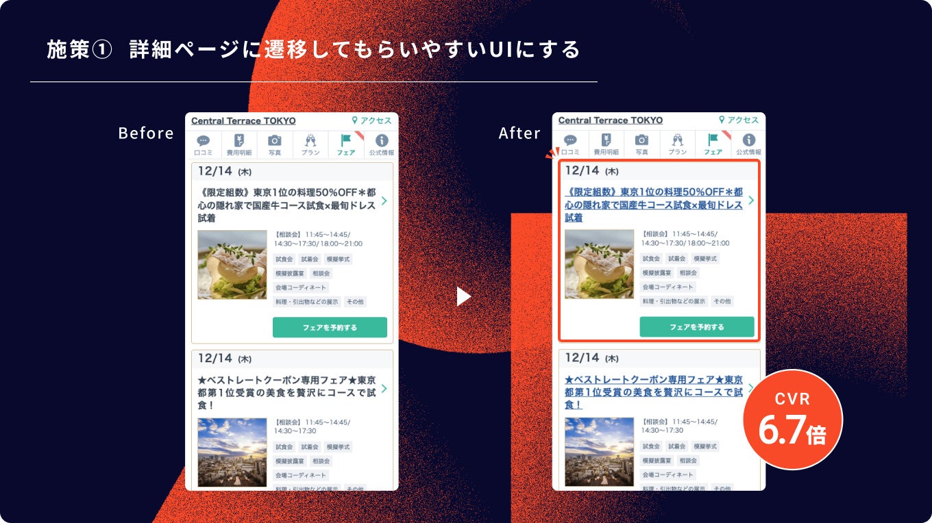 ブライダルフェアの一覧ページからブライダルフェア詳細ページへの遷移率向上に課題を感じておりました。 ブライダルフェアカセットのUI変更については、多々実施してきましたが、シンプルにタイトルに下線を引き、クリッカブルに見せるだけで数値が改善されました。