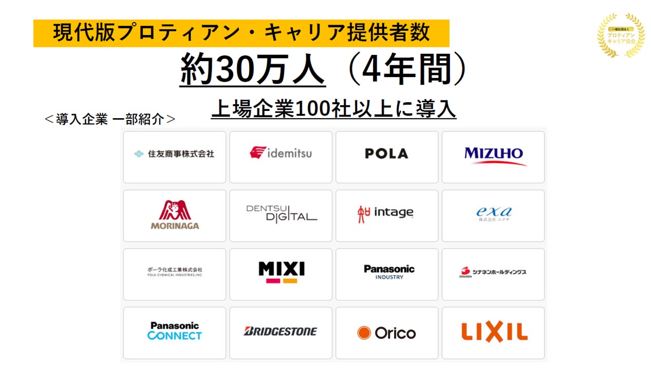 一般社団法人プロティアン・キャリア協会(東京都新宿区、代表理事:田中研之輔・有山徹、以下「当協会」)は、組織と個人のより良い関係構築と個人の主体的なキャリア開発を支援する団体です。このたび2024年5月15日(水)12時より、法人向け説明会「【4年間で上場企業100社以上が導入!】キャリアオーナーシップを推進する『プロティアン・キャリアドック』」を開催します。