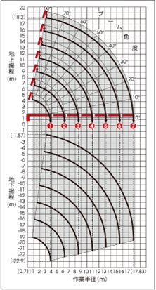 また、7段ブームを採用することにより、最大地上揚程は約18.2m、最大作業半径は約17.83mと圧倒的に広い作業範囲を可能にしました。