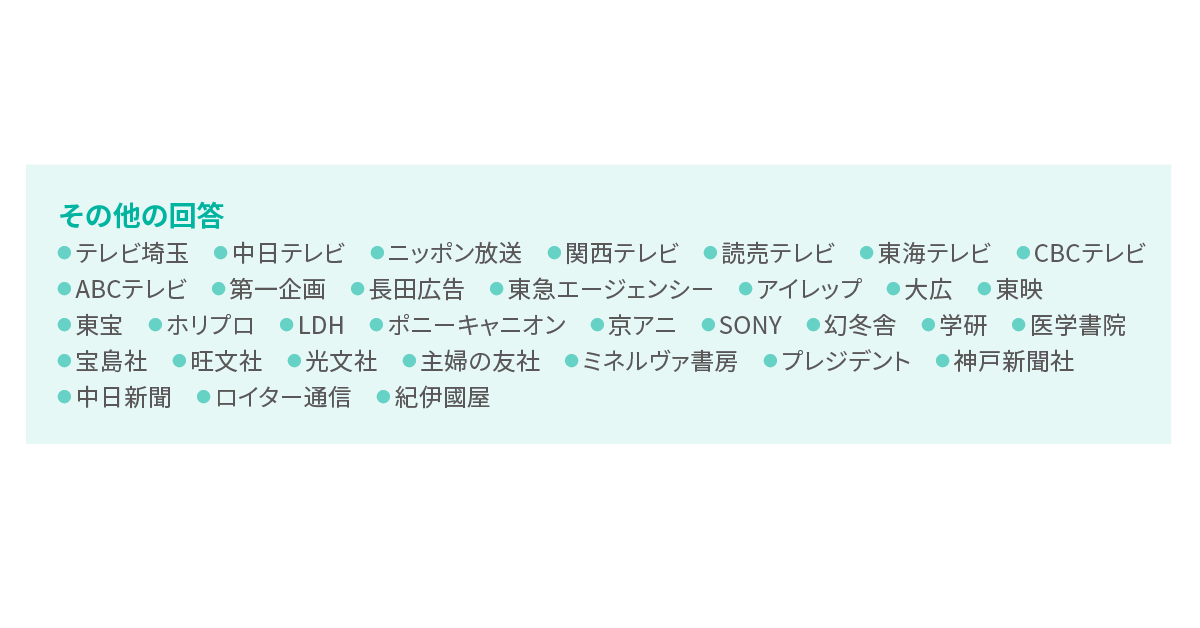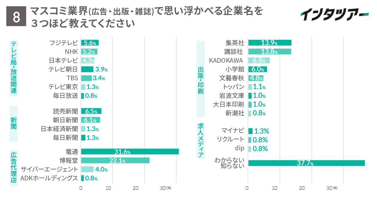 回答数が多かったのは「電通」「博報堂」といった広告代理店、「集英社」「講談社」「KADOKAWA」 「小学館」といった出版社でした。また、「読売新聞」「朝日新聞」といった新聞社の認知が「フジテレビ」「NHK」などのテレビ局よりも上位となりました。37.7%は「わからない、知らない」と答え具体的な社名を挙げませんでした。
