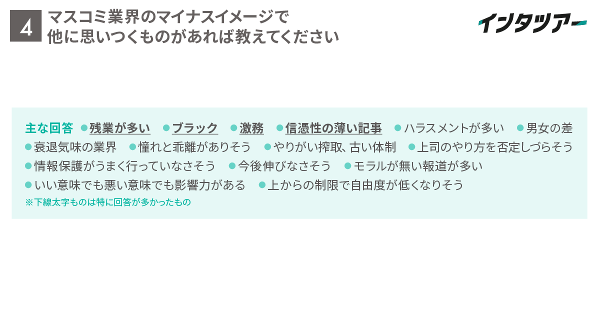 Q4. マスコミ業界のマイナスイメージで他に思いつくものがあれば教えてください(自由記述)