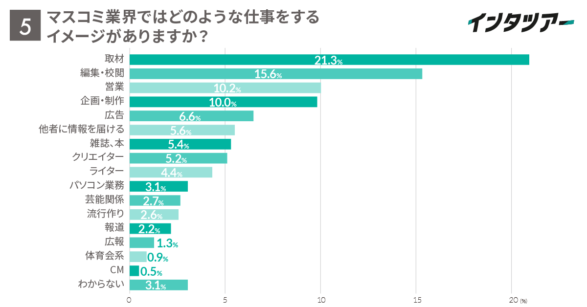 最も多かったキーワードは「取材」21.3%で、報道機関としての仕事のイメージが強いようです。続いて「編集・校閲」15.6%も多く、こちらは出版関連の仕事のイメージが強いようです。