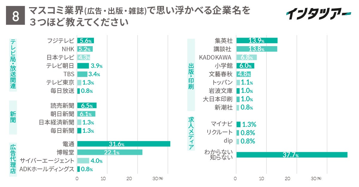 【知っている企業名】電通・博報堂が上位を占め集英社・講談社が続く