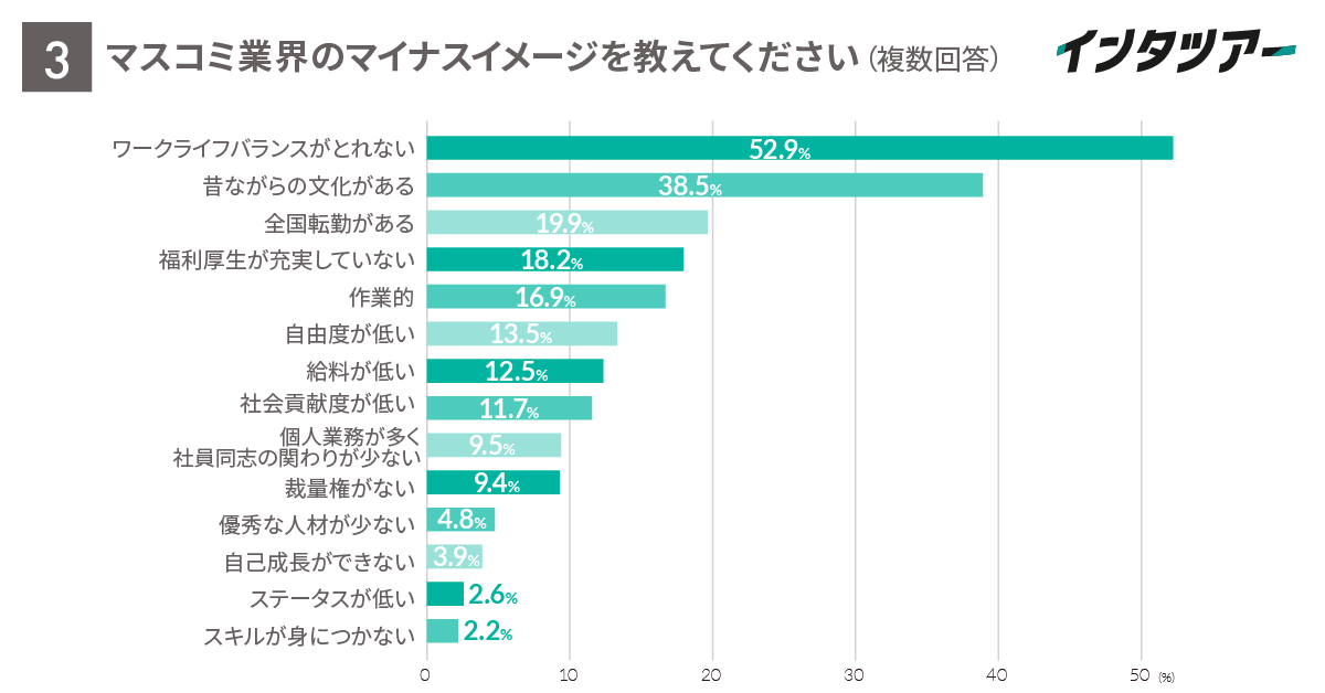 設問3ではマスコミ業界の悪いイメージについて複数回答で聞きました。