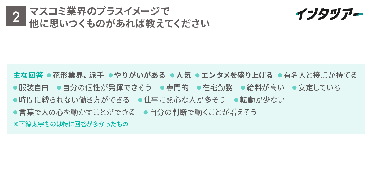 Q2. マスコミ業界のプラスイメージで他に思いつくものがあれば教えてください(自由記述)