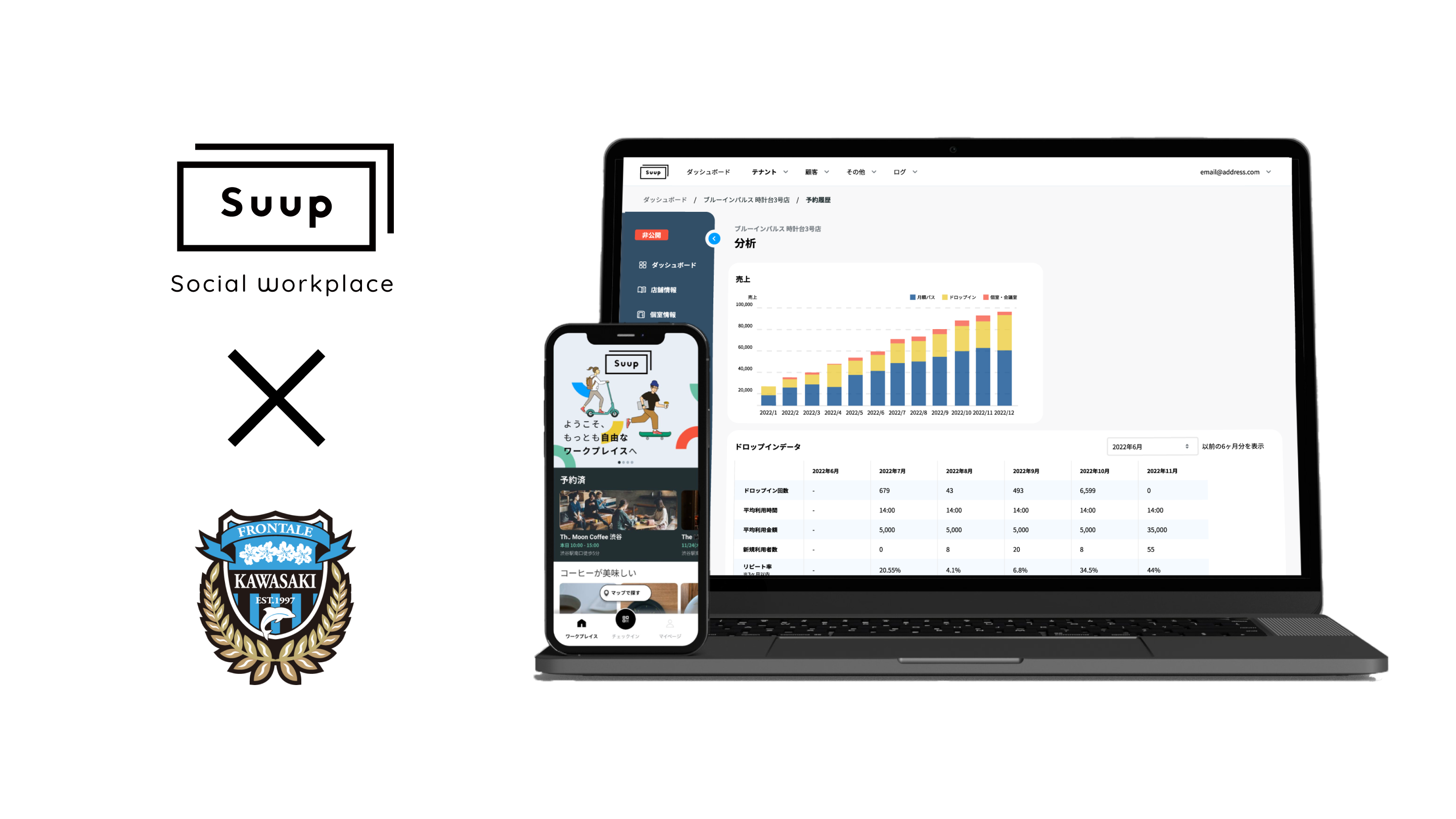Suupは郊外を中心に空きスペースの利活用に困っている企業様を支援しており、システムの導入実績については150ヵ所を超えています。今回はJリーグの中でも地域密着で活動されている川崎フロンターレ様とお取組み出来ることを嬉しく思います。ローカル型のコワーキングスペースづくりを成功させてきた知見を活かし、Ankerフロンタウン生田の一つの魅力になるようなワークスペースづくりをご支援して参ります。