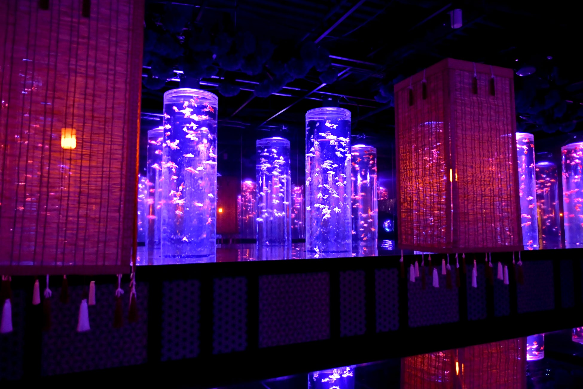 水槽作品が並ぶ空間を、変化するライティング・音楽・香りで演出するアートアクアリウムは、優雅に泳ぐ金魚と一緒にその美しさを写真や動画に収めるのも楽しみ方のひとつ。